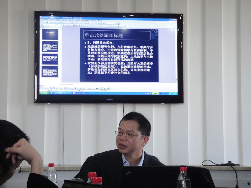 其次,陈周旺副教授根据自己多年的研究心得对如何进行中国国家转型研究提出了三点建议。第一,在中国国家转型问题可选取两种研究路径:“自上而下”的研究路径,即是研究国家权力如何向基层社会渗透;“自下而上”的研究路径即研究社会力量如何反抗国家权力。第二,在研究资源上我们应该注重利用国内外两种资源进行研究。一个是国外“国家形成”理论,另外一个是国内外中共党史方面的研究。尤其是后者,国内有着丰富但并未被充分利用的资料。第三,在研究资料的介绍中,陈德旺副教授还详细的介绍了相关理论研究的主要观点和代表人物以及彼此之间的批评与继承关系及其议题研究上的文献归类情况。他认为在研究的过程之中一定要注意到口述史与档案资料相结合的原则,这样才能克服档案资料的不足,并能保留具有真实体验的鲜活历史,同时他还强调了口述史的抢救工作的重要性。