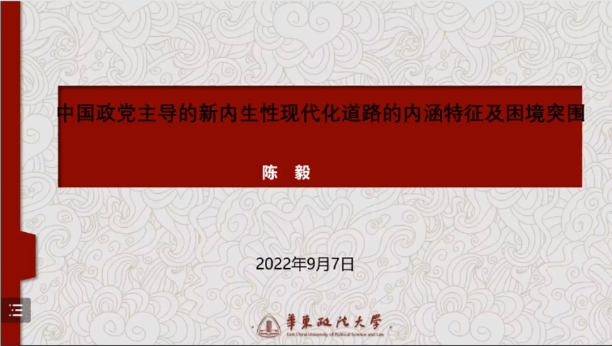 第64期中国政治研究工作坊在腾讯会议平台举行。华东政法大学政治学与公共管理学院教授、博士生导师、行政管理硕士学位点组长、教育部硕士博士论文评阅人陈毅教授受邀担任主讲嘉宾,作题为“中国政党主导的新内生性现代化道路的内涵特征及困境突围”的学术讲演。讲座由国产色情
