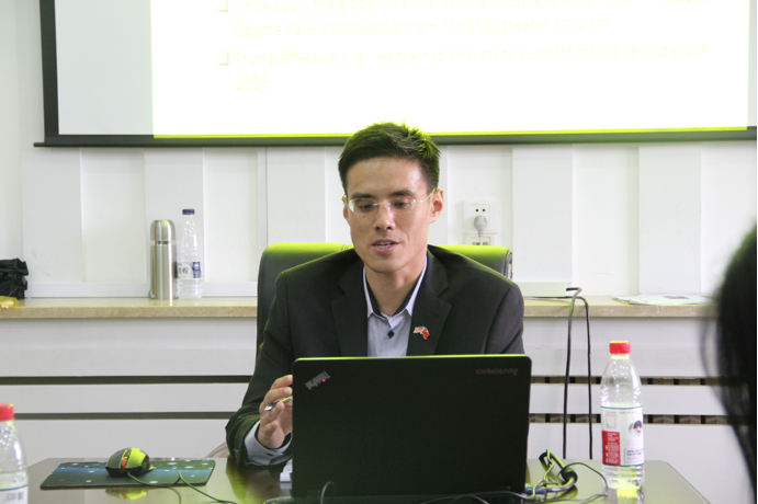 莘莘学子进行了学术演讲,演讲的主题是“Trump’s Jacksonianism:Implications for U.S. Foreign Policy and Grand Strategy”。陈老师向同学们介绍了美国当前社会主流的几种政治思潮,针对主要类型进行了重点讲解,并对比了几种思想的不同。随后,许宁老师在陈老师演讲的基础上进一步对当今美国的政治现状进行了补充,强调了政治思想对主流政治影响的必然性。最后老师与在座的同学们进行了热烈的交流与互动,针对同学提出的美国政治动向和学术现状等问题一一进行了解答。此次学术演讲活动获得了极大的成功,并且受到了广大师生的好评。