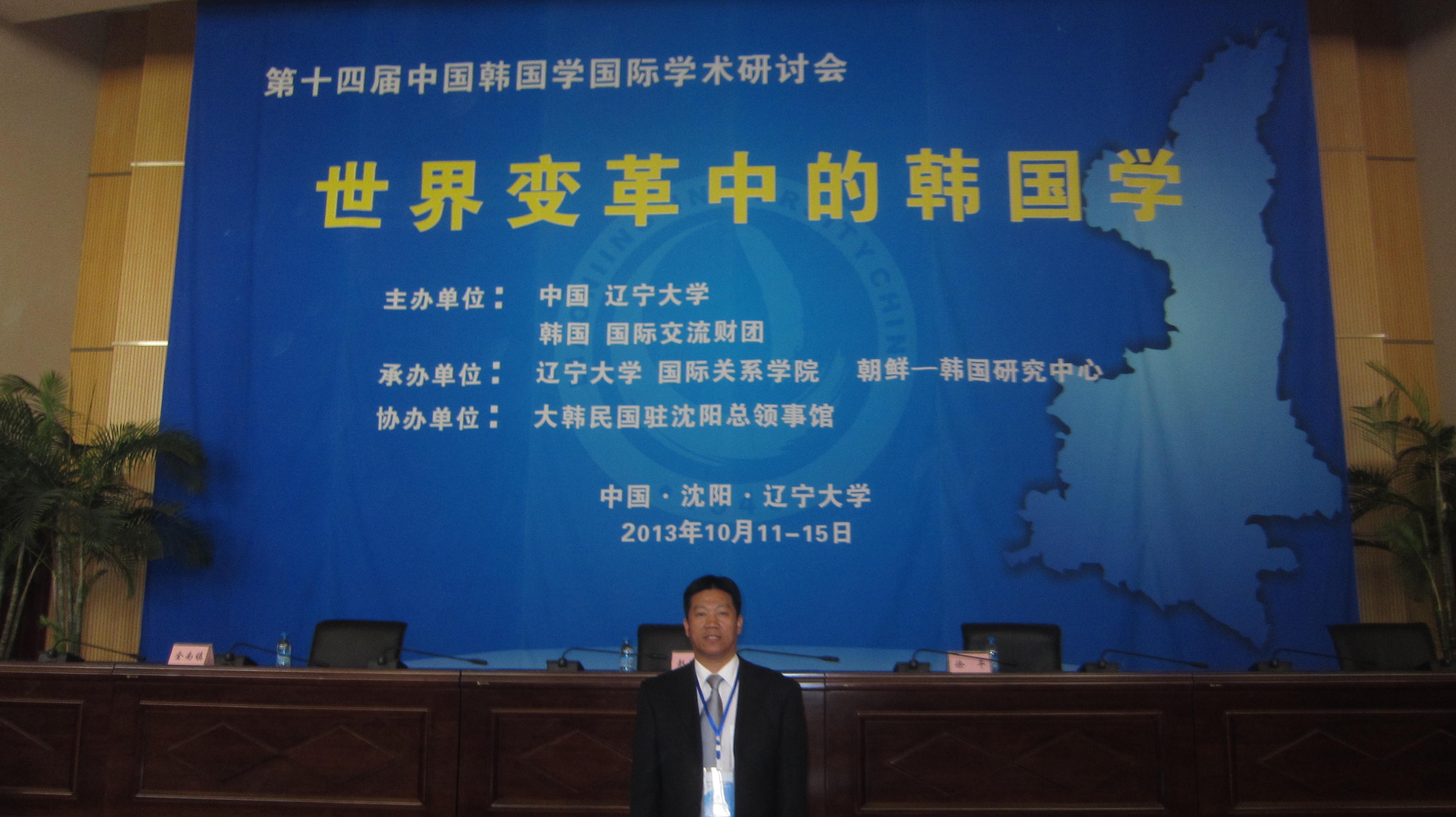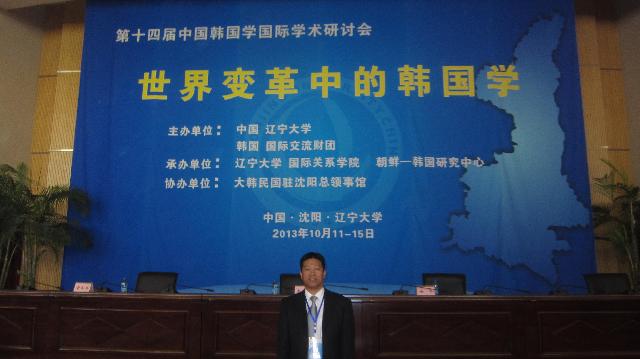 由辽宁大学国际关系学院、辽宁大学朝鲜·韩国研究中心主办、韩国国际交流财团赞助的“第十四届中国韩国学国际研讨会”,于2013年10月11日至15日在辽宁大学蒲河校区学术会议中心成功举行。我院王生教授应邀参加会议。中国韩国学国际研讨会是中国境内举办的历史最久、规模最大、层次最高的有关韩国学研究方面的年度盛会。参加会议的中外学者120多名。北京大学、复旦大学、国产色情