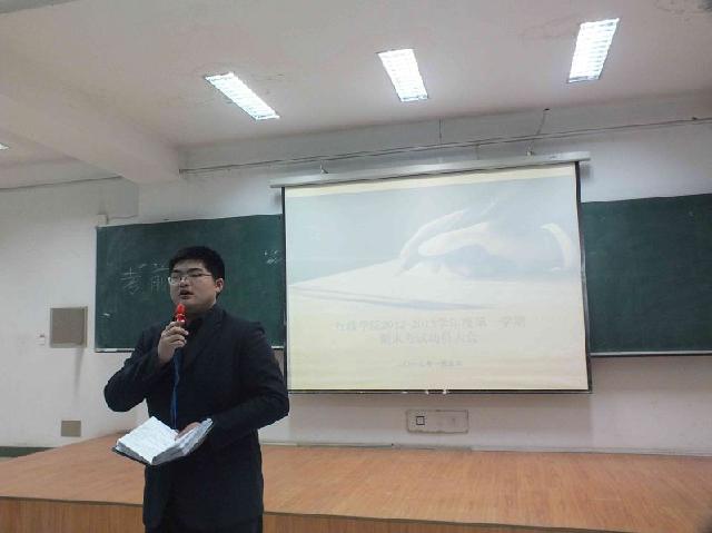 会上,佘彦老师向大家介绍了学院新任的主管教学的副院长殷冬水副教授。随后,他分别以“感谢”、“激动”与“希望”为关键词系统的总结了过去一年学院的学生工作,全面的分析了过去一年学生工作取得的成绩。他指出,过去一年学院学生工作在学院党委的领导下,在辅导员老师的辛勤工作下,同学们团结一致、积极进取、不断创新,学生工作呈现出繁荣发展的良好态势,取得了优异成绩。他希望大家再接再厉,积极参加学生活动,在活动中塑造良好的品格、完善个人素质。当谈到即将来临的期末考试时,他希望同学们务必严格遵守学校、学院的考试纪律,真正做到诚信考试。
