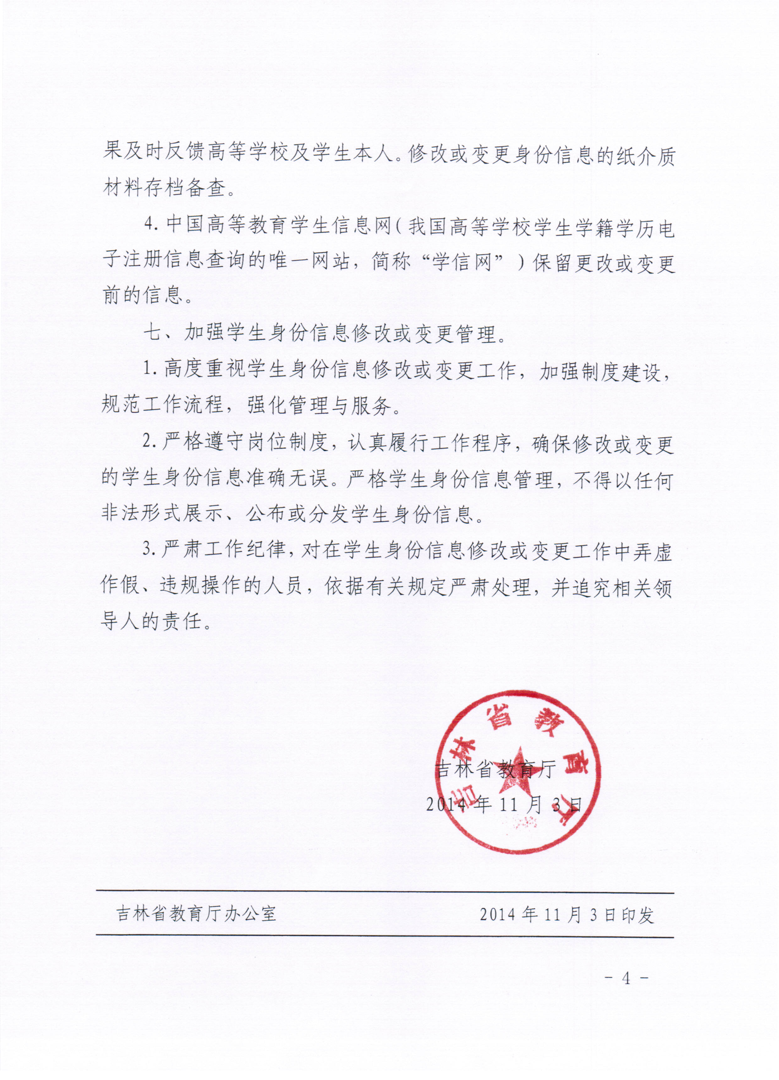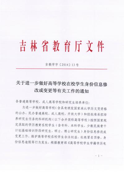 为做好高等学校在校学生身份信息修改或变更工作,维护高等学校学生合法权益,杜绝冒名顶替、身份信息造假等行为发生,吉林省教育厅日前发布了《关于进一步做好高等学校在校学生身份信息修改或变更等有关工作的通知》(吉教学字〔2014〕13号),现予以转发。