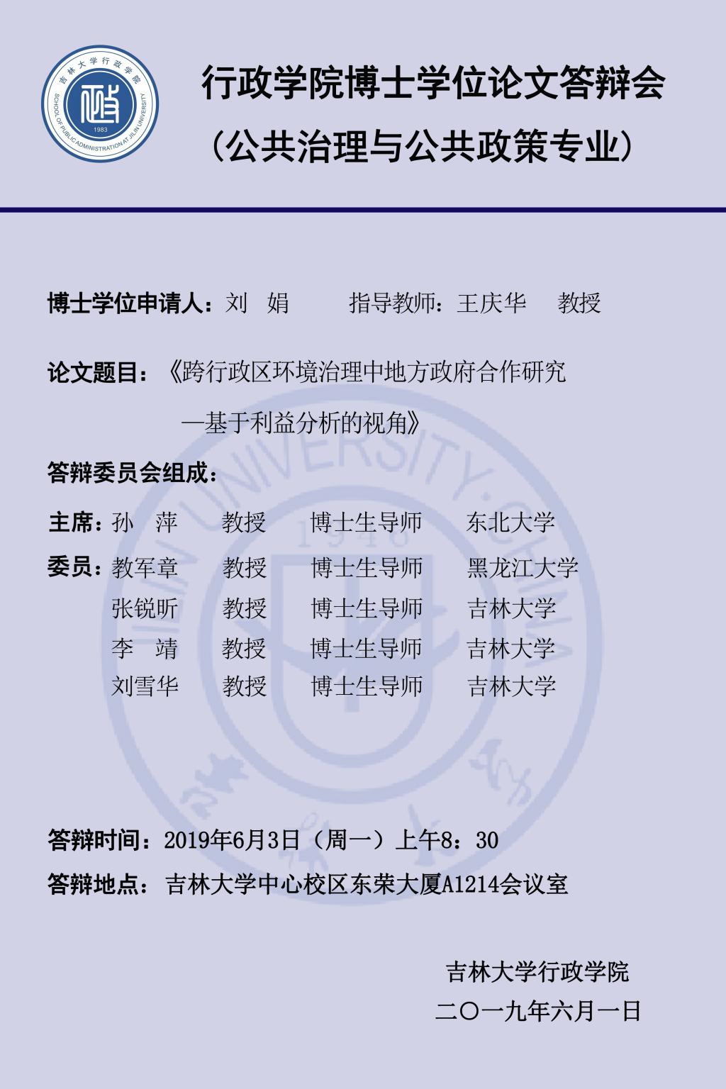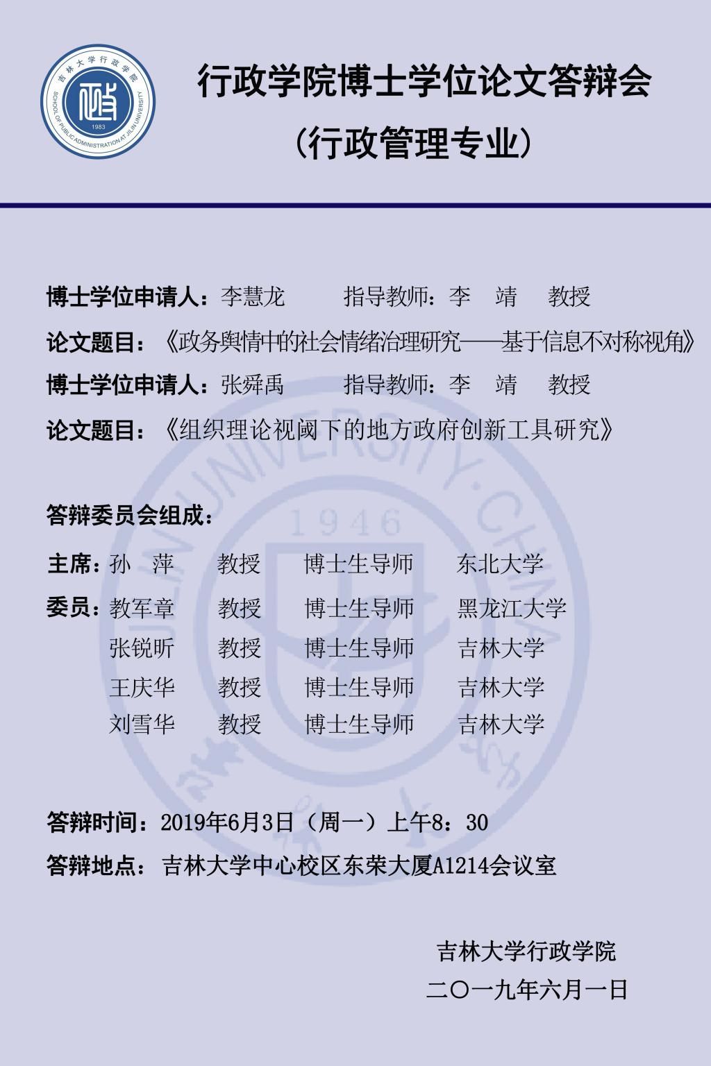 答辩学生:陈丹、张乔、董博、刘娟、李慧龙、张舜禹(同一导师名下学生按姓氏笔画为序)