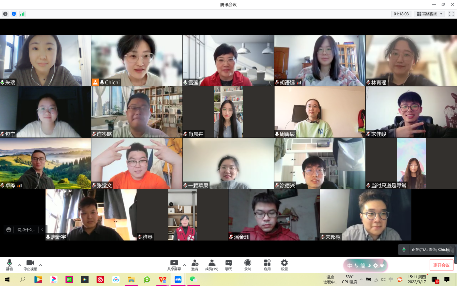 3月17日,刘雪莲老师带领18名学生开展线上讨论。刘老师首先对同学们的生活和身心健康表达了关心,叮嘱大家要好好防护,保持乐观心态。在接下来的讨论中,各位同学针对本学期的学习计划进行汇报,每一位同学展露出良好的精神状态以及积极的学习态度,令老师十分动容。最后,刘老师动情说到,“特殊时期,你们都能乐观面对,懂得感恩,并且积极向上,努力学习,你们都是老师的骄傲!期待春天到来时,我们可以在线下有更好的相遇!”