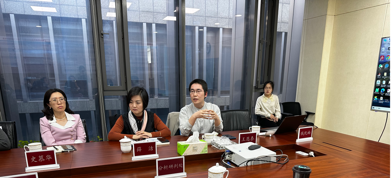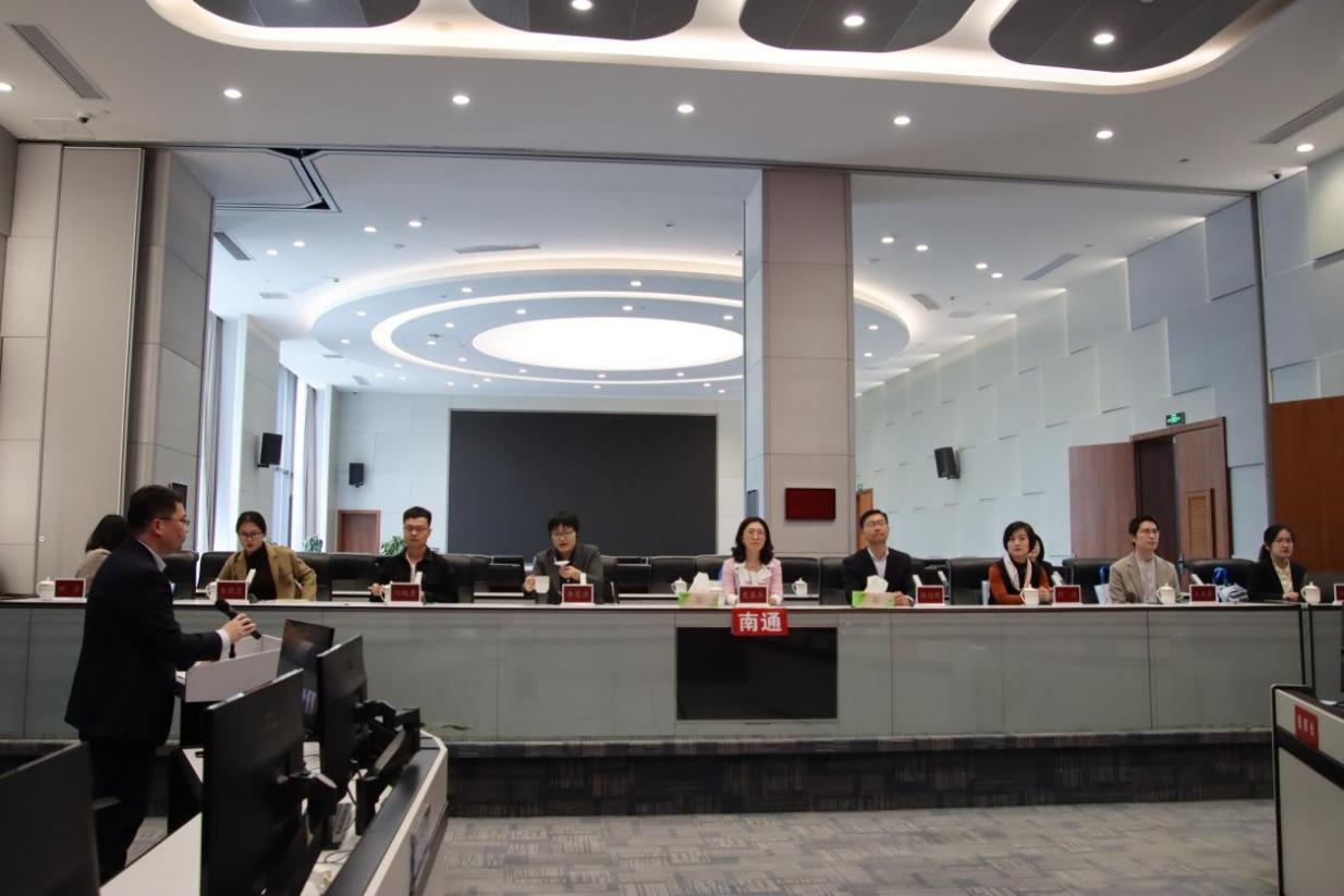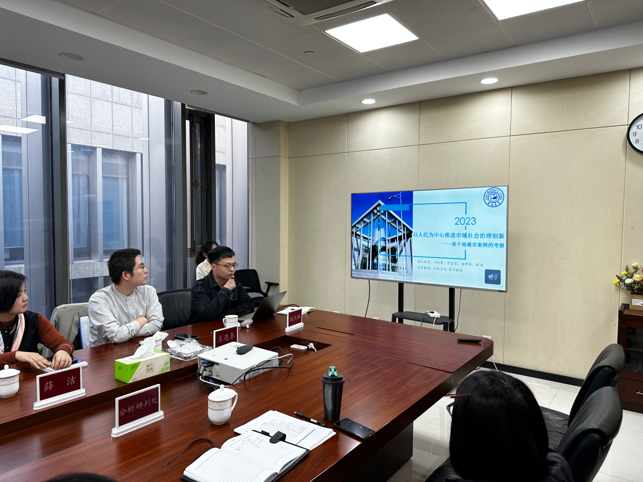 在我院师生与南通市市域指挥中心、崇川区区域治理现代化指挥中心的座谈会上,胡高明主任首先对指挥中心工作以及市域治理现代化建设情况进行了全面细致的介绍,崇川区指挥中心王强书记对指挥中心的亮点难点工作结合创新实例作了详细说明,紧接着我院党委副书记史慕华教授、政治学系薛洁教授、行政管理系副主任李慧杰副教授与指挥中心就后期的合作方向开展了深入交流与热烈讨论。随后实践基地项目汇报部分我院博士生王恩泰、闪纯晋和硕士生钱优楠分别围绕南通市外向型产业海外政策风险预警、12345政务服务热线研究开展主旨演讲,指挥中心胡主任和陈处长等对基地项目取得的前期成果表示高度肯定,并给予了完善建议。
