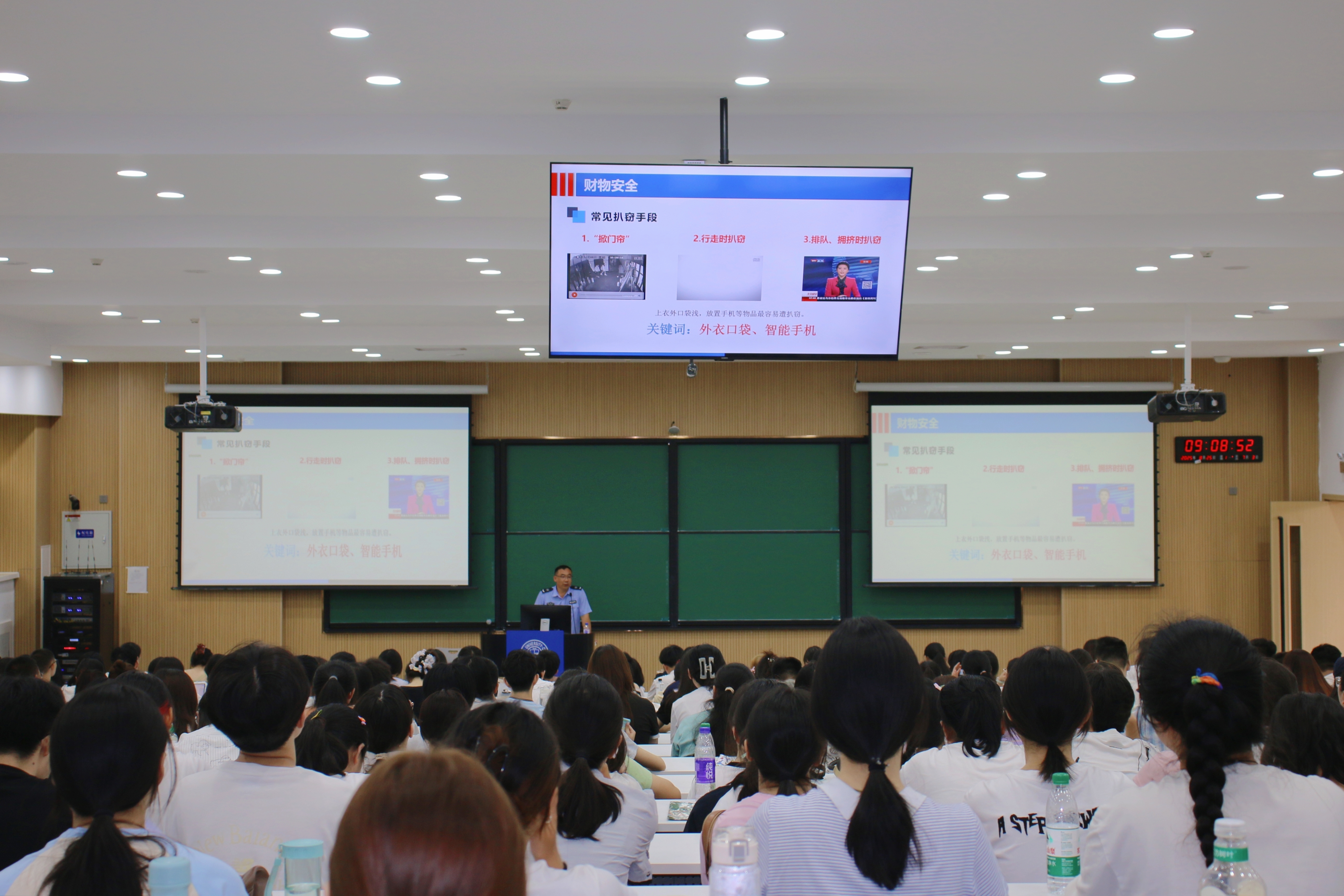 卢阳首先从人身安全出发,对校园交通问题、寝室相处问题、毒品问题、传销问题等人身安全问题进行讲解。随后,他围绕财物安全进行介绍,针对校园中的图书馆、教学楼、体育场等场所的盗窃问题提出了一些建议,并介绍了发生盗窃案件的应对方法。他还建议新生要树立牢固的自我防范意识,“人防”远大于“物防”与“技防”。最后卢阳通过列举近年来发生的一系列各类电信网络诈骗案例,向新生展示了诈骗分子的常见手段和伎俩。他特别提醒,刚入学的同学在遭遇形形色色的诱惑与各类陷阱时,务必保持清晰的判断。对于不熟悉之人的言语,切勿轻易相信;个人的私密信息,也绝不能随意告知他人。一旦发现反常或可疑的情况,要迅速联系学校保卫部门,或是向当地公安机关请求支援。最后,他激励新生们主动融入校园安全建设的行列,携手构建起安全有序、氛围融洽的校园学习与生活空间。