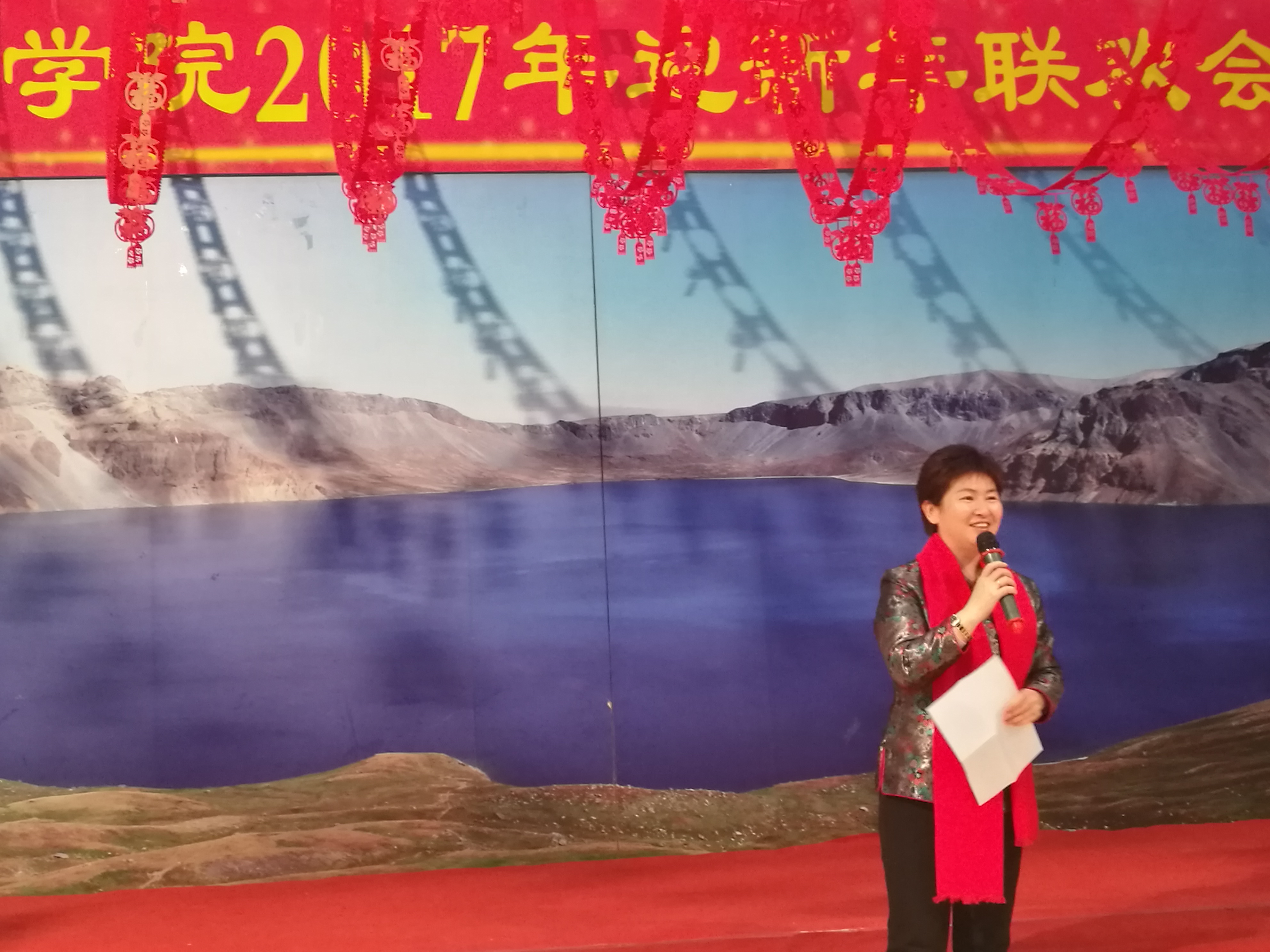 下午3点,联欢会准时开始。首先,学院党委书记魏鹤影为联欢会致新年贺词。她从党建工作、学科建设工作、人才队伍建设工作、学院管理工作、校庆工作等几个方面回顾了学院过去一年取得的优异成绩,并对2017年的工作进行了展望,希望大家团结一致、努力拼搏,为学院的发展添光增彩,同时,魏书记也表达了对全院教职员工的感谢和新年祝福。