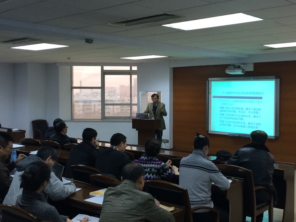 党委邀请周光辉教授为全院教职工做十八届四中全会精神辅导暨学术研究心得专题报告。党委书记边铁主持报告。