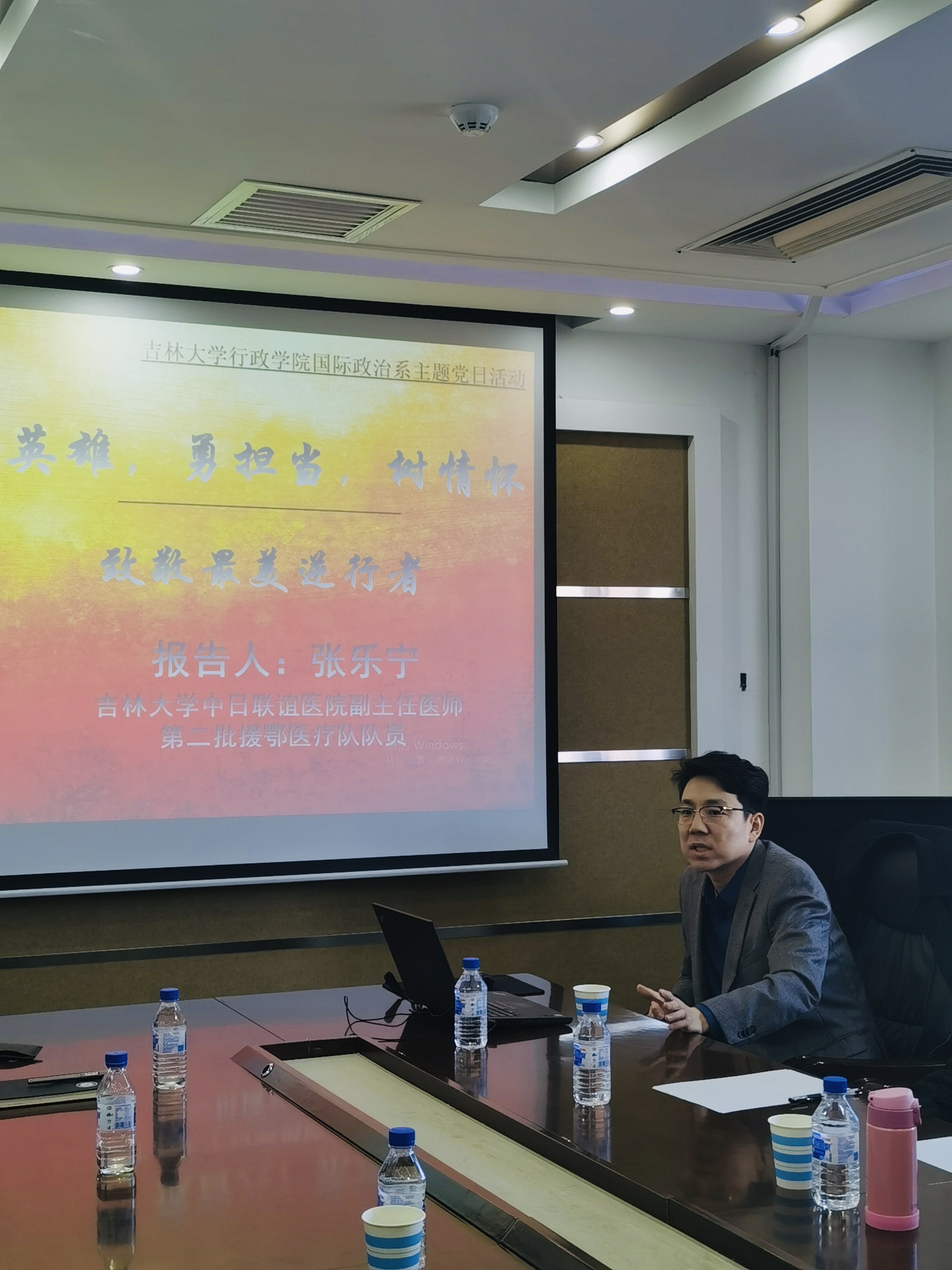 为弘扬伟大抗疫精神,激励各位党员同志的责任感和家国情怀,2020年12月16日,国际政治教工党支部在东荣大厦1214会议室举办了以“学英雄,勇担当,树情怀——致敬最美逆行者”为主题的专题党课。支部特意邀请到吉林省第二批援鄂医疗队队员、国产色情