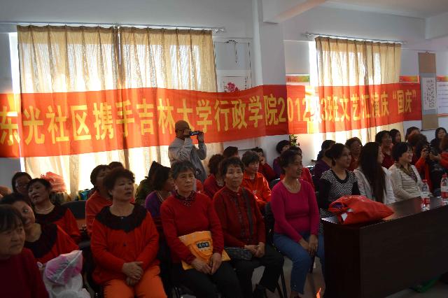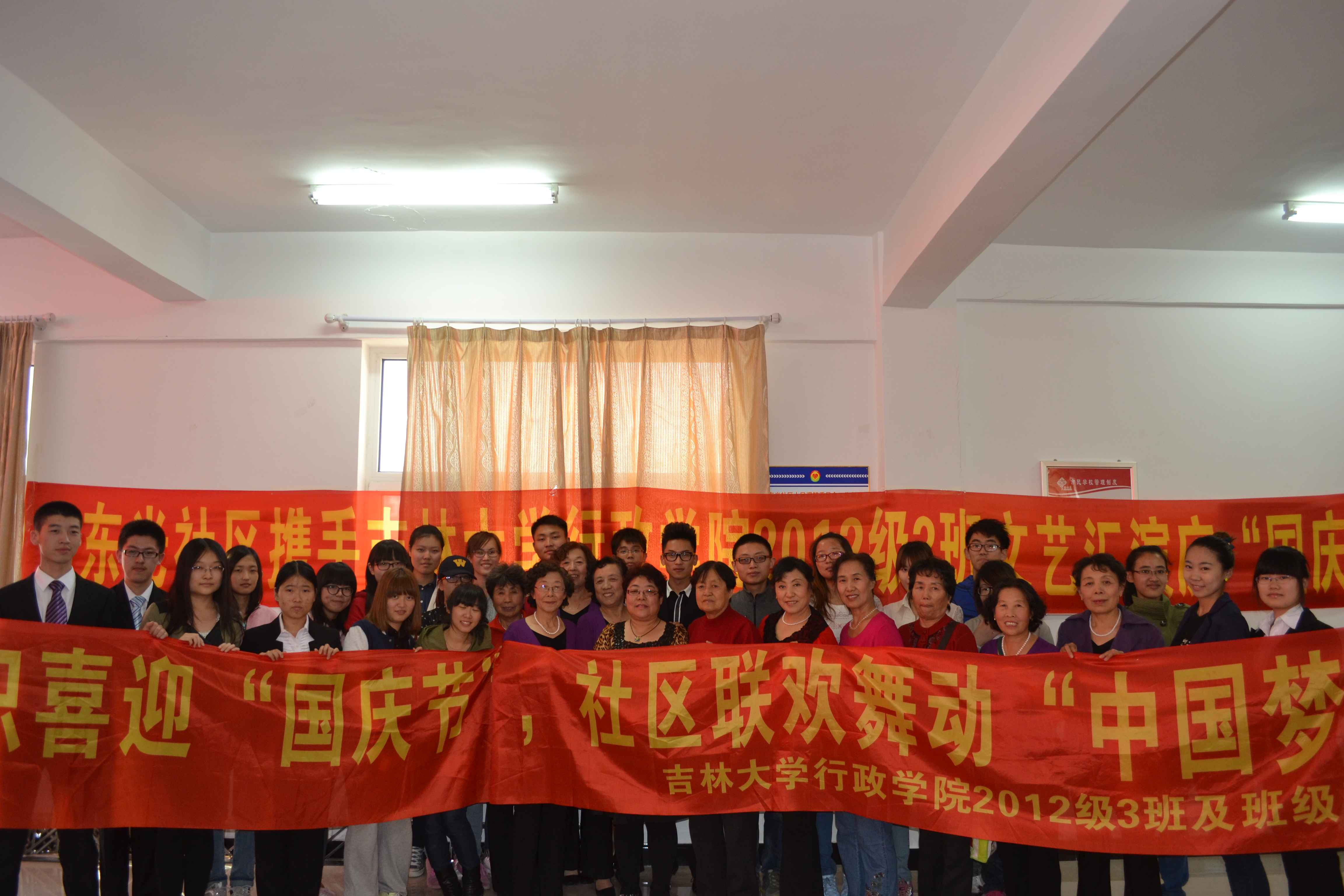 081203班于2013年9月27日与长春市前进街道东光社区携手举办“喜迎国庆节·联欢舞动中国梦”联欢活动。此次活动在东光社区社区服务大楼会议室举行。东光社区党总支书记曹伟,副书记王晶以及东光社区部分群众和国产色情