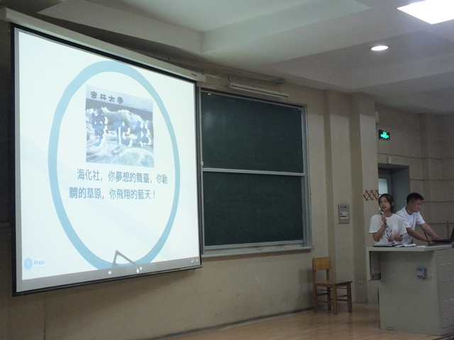 院属七大学生社团负责人依次上台展示了各自社团的风采。以人脉银行和公务员培训活动为主的同为社,新晋成立的政能量志愿者协会,主打学术活动的思潮学社,活动丰富、充满活力的海化社,带领同学们纵横国际政坛、感受世界政局风云变幻的ICU模拟联合国协会,致力于通过实践研究三农问题,关注基层生活的农村发展研究会和展现外语魅力的国产色情