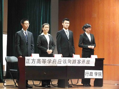 代表队由一辩李沁妤、二辩高晗、三辩王小勃、四辩段志远组成,秉持“高等学府应该向游客开放”的观点,反方金融学院代表队的观点为“高等学府不应该向游客开放”。