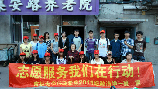 政治学一班的学生。在父亲节来临之际,6月9日星期六这天, 2011级政治学一班全体同学来到吉林省长春市集安路养老院进行社会志愿服务活动,本次活动同时也得到了长春晚报和吉大新闻网的报道。