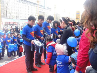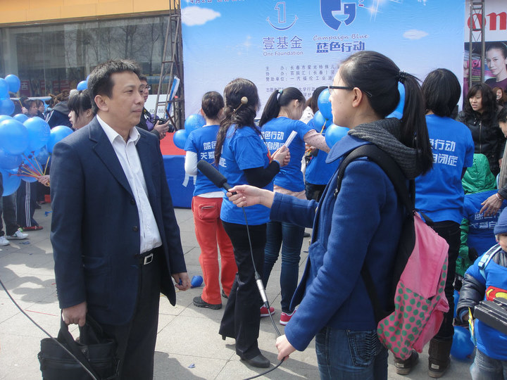 4月2日,星光志愿服务队同学早早来到长春市红旗街百脑汇门前的“放飞梦想”活动现场,悬挂蓝色宣传条幅、发放自闭症日宣传单、散发蓝色气球,快乐地忙碌着。自闭症儿童及其家长们来到活动现场,其家长代表表达了对我院志愿者一直以来对自闭症儿童的志愿服务的感激之情,名叫渺渺的自闭症男孩演唱《北京欢迎你》表达对志愿者的感谢,我院志愿者也为孩子们送上精心准备的学习用品。