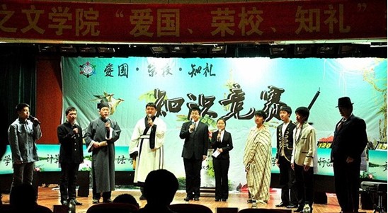 知识竞赛分为“针锋60秒”、“一唱三和”、“智慧交叉”、“我爱记歌词”、“劳逸结合”、主题演讲六个环节,中间穿插各院独具特色的风采展示。比赛在软件学院“极夜乐队”的原创歌曲中拉开帷幕。在“针锋60秒”环节中,需要选手在一分钟内答出十道题,我院选手接连答对九道,充分体现了深厚的专业功底。第一环节结束,文学院献上古筝、二胡伴奏朗诵 《我的祖先名叫炎黄》。接下来是我院代表队的名人COSPLAY,用从古至今、中国与西方先贤的经典话语展示高尚的政治思想,体现了国产色情