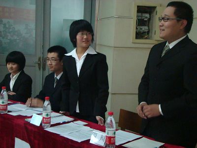 薛洁老师、赫泉玲老师、马雪松老师、陈新博士以及校辩主教练刘洋应邀出席本次比赛并担任评委。出席本次活动的还有“行政论坛”的教练员、学生会成员,10级全体学生参加了本场比赛。