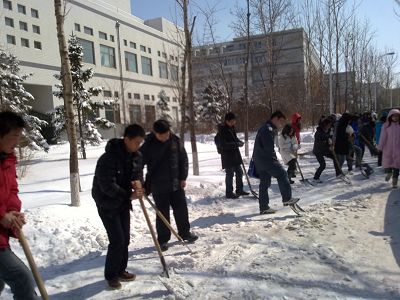 由于这次降雪量较大,扫雪工作时间紧,任务重,但是为了保障学生的安全出行,维护校园的美好环境,08和09级的同学共同承担了开学第一次的清雪工作。两个年级的同学分工明确,密切合作。尽管天气很冷,积雪难清,但是青春洋溢的同学们依旧饱含热情,奋力挥舞手中的工具,将厚厚的积雪除走,行人的足下不再有光滑的冰面,同学们用自己的劳动让学生们放心地在吉大校园里行走。