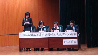 7日下午1:00,我院与生命科学学院展开激烈角逐,在“以暴制暴是不是打击恐怖主义最有效途径”的辩论中,正方生命科学学院以暴力手段时间短、见效快、威慑力强为基点,用现实事例展开论述;而我方认为“恐怖主义”不等于“恐怖主义行为”,从思想根源上打击恐怖主义才是长远之计、才会维护世界和平,而暴力手段有时限性,并且耗费人力、物力、财力,会造成更多的无辜百姓遭受灾难。