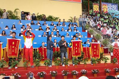 一年一度的校运动会在拼搏和汗水中结束了,我院师生用行动创造了另一份辉煌——本届运动会上,我院运动健儿以总分220分,7金5银2铜的优异成绩位列全校第三名。特别值得一提的是,我院07级的韩梦茵同学在女子标枪比赛中以44.5米的好成绩打破了尘封16年的纪录,成为新纪录的保持者;08级的李鹏龙同学一人勇夺三枚金牌,几乎占全校金牌总数的九分之一。同时,我们精心准备的长拳和舞蹈表演也得到校领导和专家评委的一致好评。