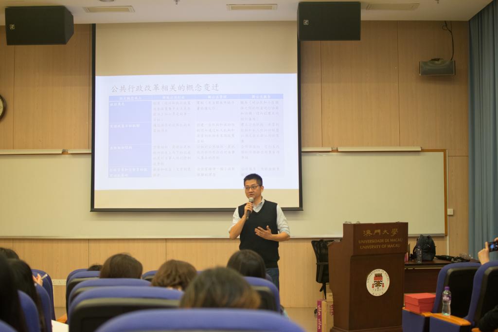 刘雪华教授,题为“廉能文化建设:我国廉政建设的新视野”的学术讲座和澳门大学社会科学学院政府与行政学系助理教授陈建新博士,题为“社会变迁对澳门治理的影响”的学术讲座。刘雪华教授介绍了高压反腐下存在的“廉而不为”现象,并从公权力性质,制度诱因和陷阱、公职人员的理性人角色等三个方面分析了其深层原因,探讨了廉能文化建设的必要性及基本路径。陈建新博士以行政改革相关的概念变迁为主要内容,探讨了绩效评估机制、政府规模、政府大数据应用等三个主题。讲座过程中,陈建新博士为在场师生介绍了青岛模式、福建模式、杭州模式、甘肃模式和广东试验等地方政府绩效评估模式,重点对广东试验模式的特点进行了总结。他还介绍了澳门特区政府绩效治理的发展情况,并指出了满意度评价存在的问题。他强调,政府规模小可带动经济增长;体现新公共管理理念的行政改革可提升行政效率;建立“企业型政府”来提升公共服务质量及效率;数据越大、融合性越高,数据的社会效益便越高。在交流环节中,调研团师生分别就政府购买公共服务的种类和范围、累积性满意度调查问卷使用者忠诚指标解读、智慧城市建设与大数据潜在风险等方面内容与陈建新博士进行了深入探讨。