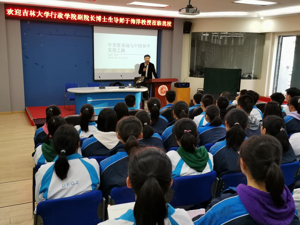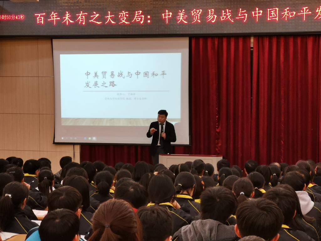21日下午,我院一行来到湖北省重点中学东风高级中学。首先,于海洋教授在报告厅为100余名高三文科生做了题为“百年未有之大变局:中美贸易战与中国和平发展之路”的专场学术报告。随后,进行了“国产色情