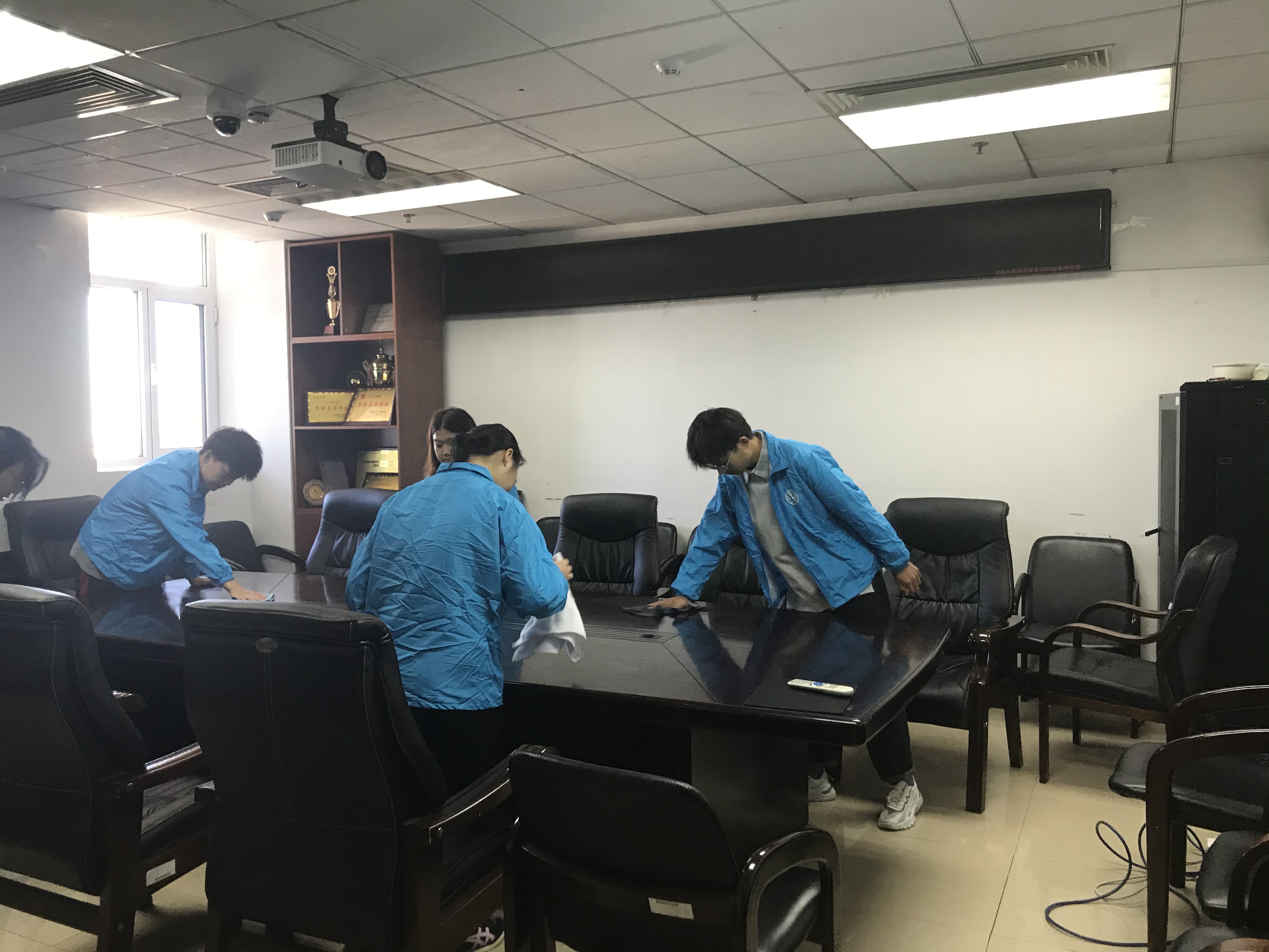 紧接着,同学们转步到东荣大厦12楼,组织进行劳动实践教育,细致清扫学院办公室、储物室和会议室等办公区域,擦拭会议桌,储物架及过往获得的荣誉奖杯,整理迎新活动的备用物品及未来活动道具,在擦拭整理中重温学院过往。活动结束后,同学们进行思想交流,在总结收获中坚定理想信念。