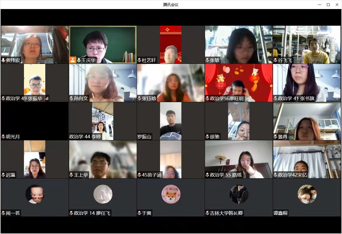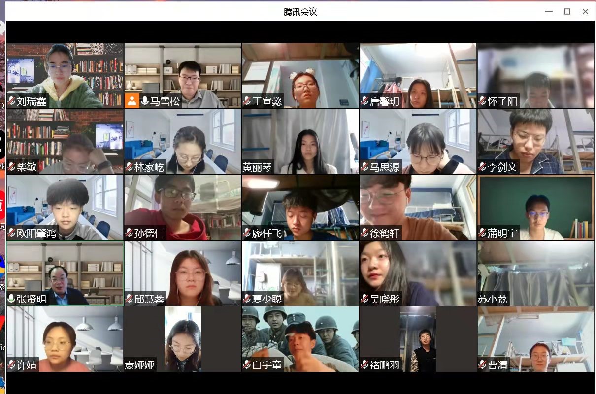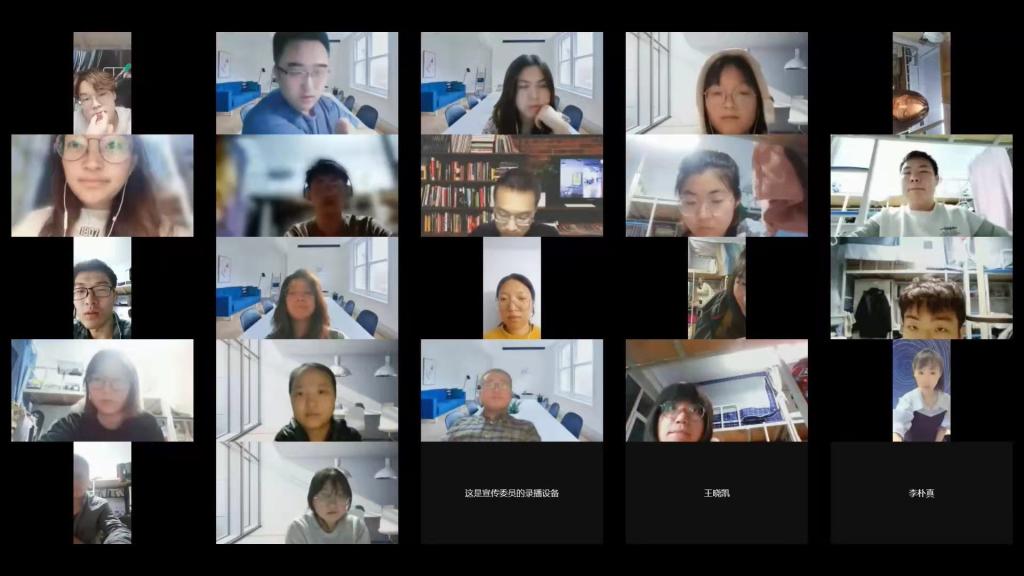 15日上午,在2020级五班班会上,班主任王庆华老师、于君博老师通过视频会议与全体同学见面,了解同学们居寝学习期间的困惑和需求。见到彼此熟悉的面孔。班会伊始,庆华老师问候了全班同学的近况,景冉、张振华同学代表班级同学从个人生活学习情况出发,向老师们汇报了当前的居寝情况,两位同学都认为,当前隔离情况虽对生活有所影响,但是学习效果仍能保证。随后,老师们从自身线上授课的角度出发,与同学们交流线上学习的需求和可改进之处。最后,君博老师进行总结并勉励同学们尽快适应线上学习和居寝生活,在隔离期间利用好时间,勤加思考,为未来进行提前规划。