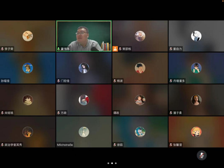 3月21日晚,在2020级二班的班会上,各位同学与刘畅、张力伟两位班主任老师再聚线上,首先,班级同学与老师们相互分享了隔离生活的点点滴滴,营造了良好的交流氛围。刘畅老师关照同学们要注意疫情防控,遵守学校的相关规定,并鼓励同学们在隔离期间拓展自己的才艺,多与大家线上互动交流。此外,刘畅老师还向大家介绍了大创立项与结项的相关事宜。张力伟老师向同学们简单介绍了学院的“英屹计划”资助的征文比赛,并鼓励同学们积极投稿,勇于尝试,在征文写作过程中锻炼自己的学术思考与研究能力。针对同学们在文献阅读方面的疑惑,张力伟老师指出,在文献研究过程中要注重问题导向。两位班主任还就疫情防控情况下如何开展调研与同学们进行了细致地交流。