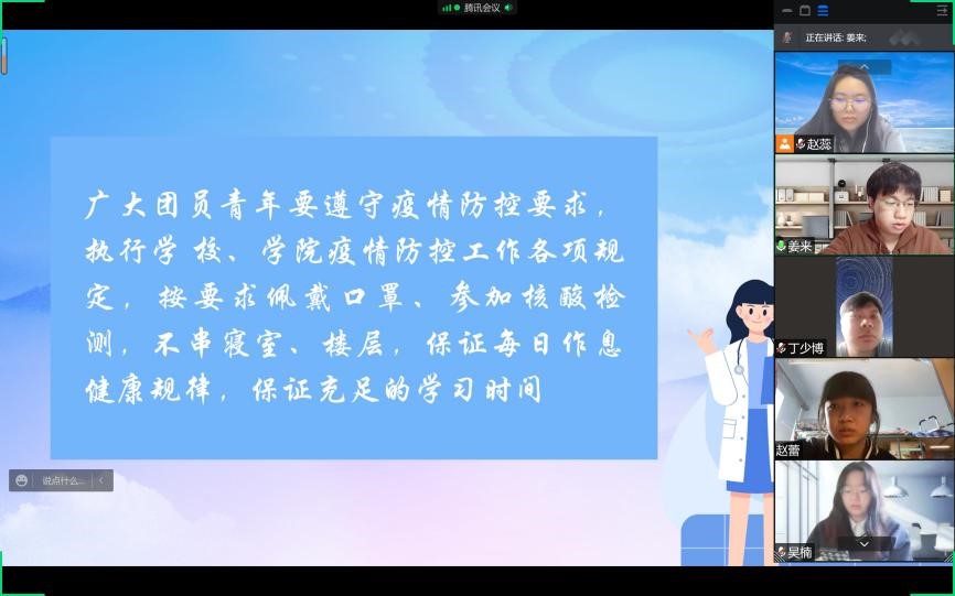本次团日活动以腾讯会议的形式开展,整体分为学习解读、分享感悟、总结收获三个环节。活动伊始,各班团支书带领大家认真学习了本月理论材料,并结合教育部近期颁布的教学文件与自身经历进行讲解,使同学们更好地了解到党中央对防控疫情的坚定信心,对民生的真实关切,对部署工作的严谨思虑,同时还加深了同学们对现有校园疫情防控政策的理解。随后,同学们结合身边的抗疫事迹积极分享自己的感悟,梁恩昊(2019级本科生)从自身预备党员的身份着手,分享了自己担任宿舍楼志愿者的心得感悟,表示自己的党性修养在疫情防控的志愿服务实践中得到了锻炼提高;周密(2019级本科生)从疫情期间大学生心理健康问题出发,鼓励同学们正确处理焦虑、抑郁情绪,通过学习,运动,心理咨询等方式调节自身心理状况,以积极心态迎接困难;贺洋(2019级本科生)分享了封寝期间教师和其他学校工作人员以及志愿者所展开的具体工作,鼓励大家坚持防疫、做好相关的自我防护。最后,各班团支书归纳总结了同学们的发言,号召全体团员坚定抗疫必胜的信心,践行“同心战‘疫’,请党放心”的青春誓言。
