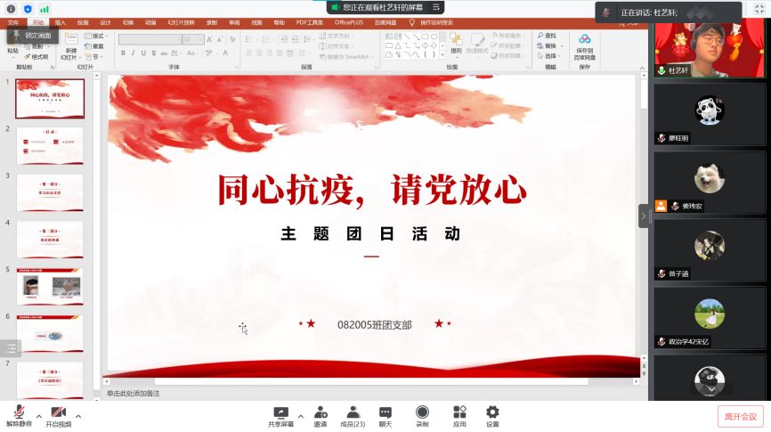 本次线上团日活动中,各团支部主要通过学习防疫规范、介绍身边的防疫先进事迹、总结收获三个环节进行深入学习交流,以加强支部成员对疫情形势与当下防控部署的认识,坚定支部成员对打赢本轮疫情防控阻击战的信心。首先,各班团支书组织同学共同进行了宿舍防疫规范的学习,马思源(2020级本科生)围绕对四个防疫规范的介绍,倡导同学们积极响应、自主参与到疫情防控工作中,并在自身防护方面阻隔好新冠病毒。各班同学对身边的防疫先进事迹都深有并踊跃发言,杜艺轩(2020级本科生)为大家展示了学校疫情防控过程中辅导员辛勤劳作和学生志愿者积极奉献的画面。朱悦(2020级本科生)着眼生活与工作两个角度为同学们分享了疫情中的感人事迹,并指出人民都承担且完成着自己的使命,共同构筑成了坚不可摧的城墙。最后,同学们互相交流了意见,充分表达了自己对于学习习近平总书记关于疫情防控工作的重要讲话和重要指示精神的心得。同学们纷纷表示此次团日活动收获颇多,并在学习中更加坚定了打赢本次疫情防控阻击战的信心。