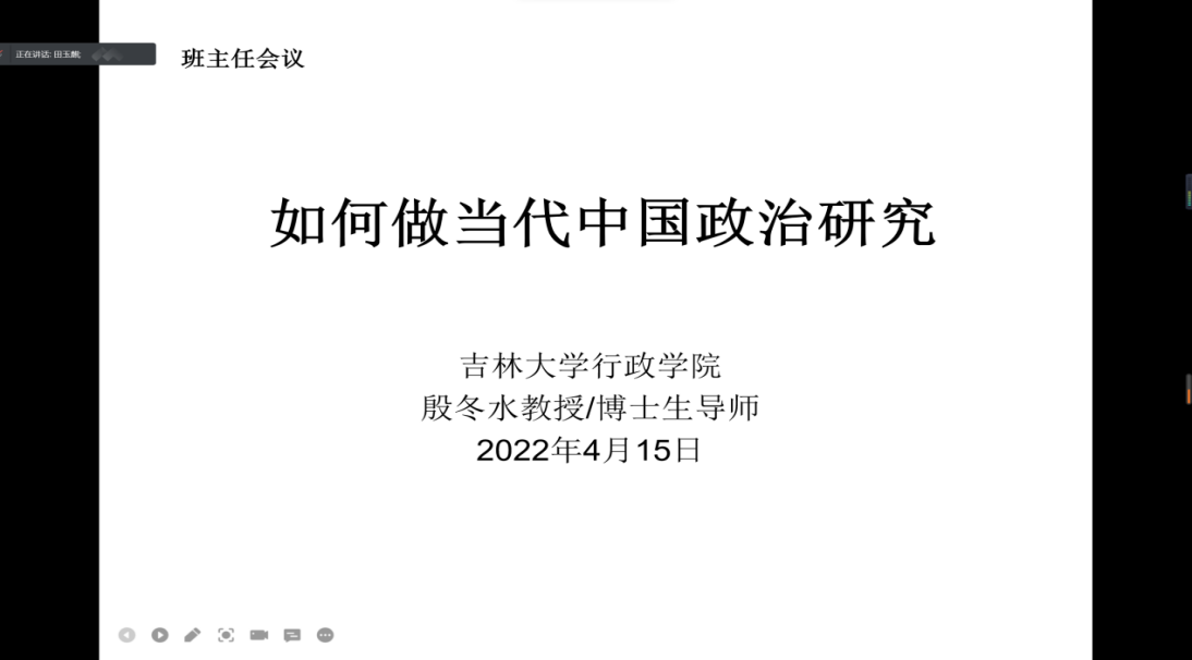 2018级四班的各位同学通过视频会议的方式开展了本学期第五次抗疫主题班会。此次班会由殷冬水老师主讲。殷冬水老师首先关心了同学们的封校情况,详细了解了同学们的学习生活情况。针对一些同学即将读研的情况,以“如何做当代中国政治研究”为主题进行了讲解。殷冬水老师介绍了政治学研究的发展阶段及变化,重点讲述了为什么以及如何做好当代中国政治研究,为同学们今后的研究生学习提供了指导性意见。