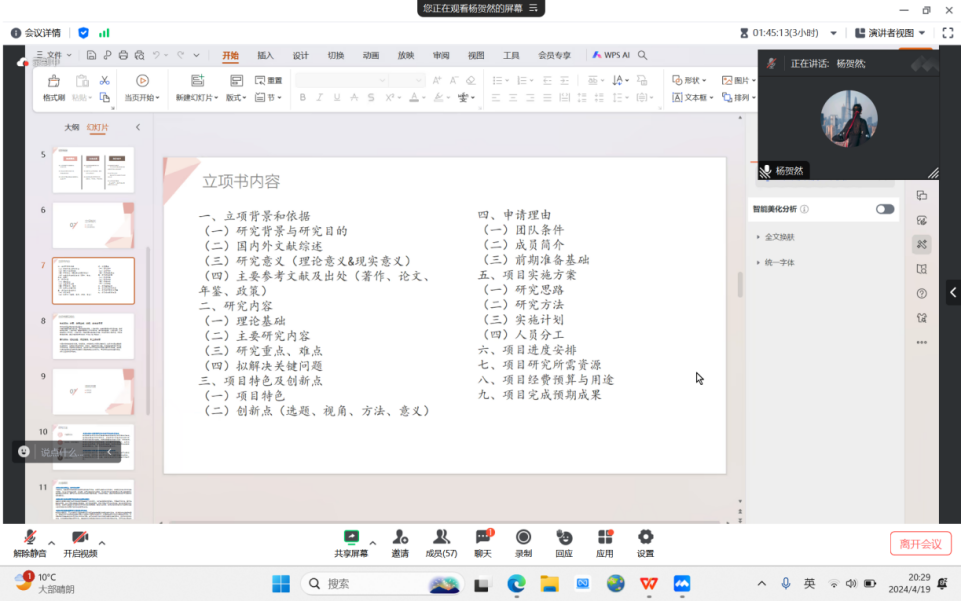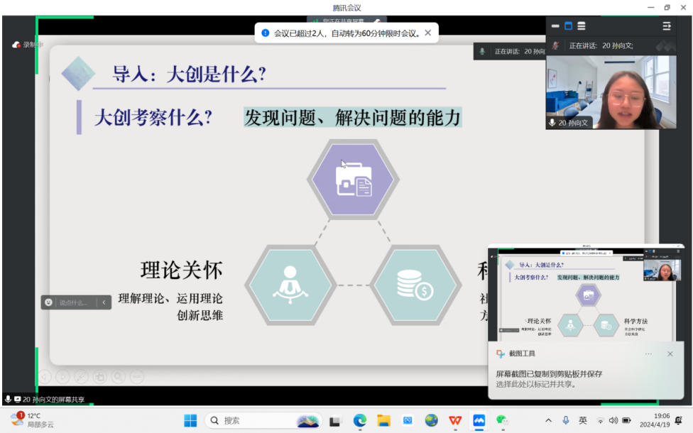 孙向文以“从组队到立项——大创经验分享”为题,从整体的角度分享组队、选题、研究方法、立项材料以及答辩过程中的技巧和侧重点,回答了与会同学的疑问。杨贺然以“大创之路初探——大创相关问题的解读与分析”为题,从具体的角度解答了同学们在大创立项、团队组建、导师选择、立项书撰写等方面的疑惑。总结阶段,同学们纷纷表示收获颇丰,今后将以更加积极主动的心态参与到各类创新创业实践活动中,努力在创新创业项目中取得好成绩。