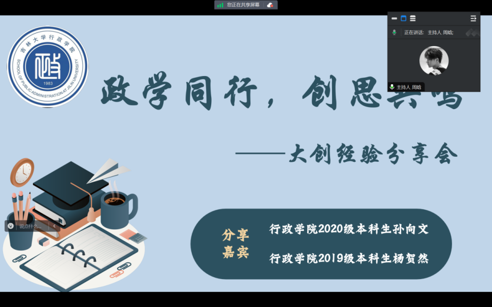 组织召开“政学同行、创思共鸣”大创经验分享会,邀请学院2020级本科生孙向文和2019级本科生杨贺然带来经验分享。