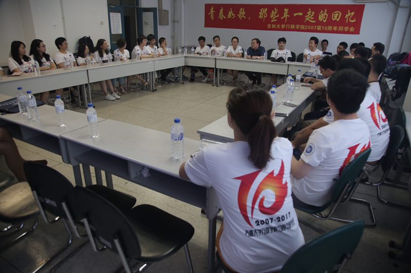经过精心的准备,7月15日上午,本次同学会的座谈会在中心校区逸夫教学楼221教室举行。院长张贤明、党委副书记兼副院长史慕华出席了座谈会。座谈会上,张贤明院长代表学院对2007届本科毕业生回到母校、回到母院表示了热烈的欢迎。他从学院的师资力量、学科发展、科学研究和人才培养四个方面向同学们讲述了学院10年来的发展情况。他指出,学院的发展离不开大家的支持,大家的支持也成就了学院。他希望大家在自己的工作岗位上尽职尽责,把学院的优良传统坚持、传承下去。时任2007届本科毕业生辅导员的史慕华副书记,对大家回到长春表示了欢迎,并分享了与大家在一起的美好回忆。她表示,大家的碰到是幸运、相遇是幸福,大家是相互陪伴着成长的,都在彼此的生命中划上了浓重的一笔。她勉励同学们成为对自己、对社会、对国家负责的人。同学们讲述了10年来自己的变化和心路历程,并一起观看了毕业生代表精心准备的大学四年照片影像。