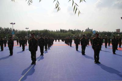 的新生进行着艰苦的军事训练。他们在教官的指导与带领下认真地完成每一项军训任务,提高自己的军事素质。夜晚的篮球场也有他们的身姿,一套并不复杂的军体拳展现着他们的风采,一首首嘹亮的军歌传达着他们的精神。