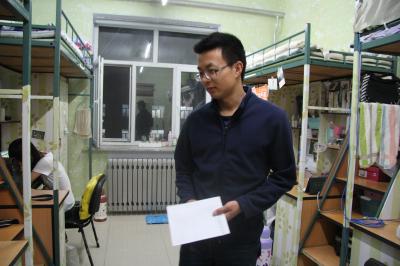 本科生辅导员曲畅竹与生管会学生一同进入大学城学生宿舍,进行查寝活动。