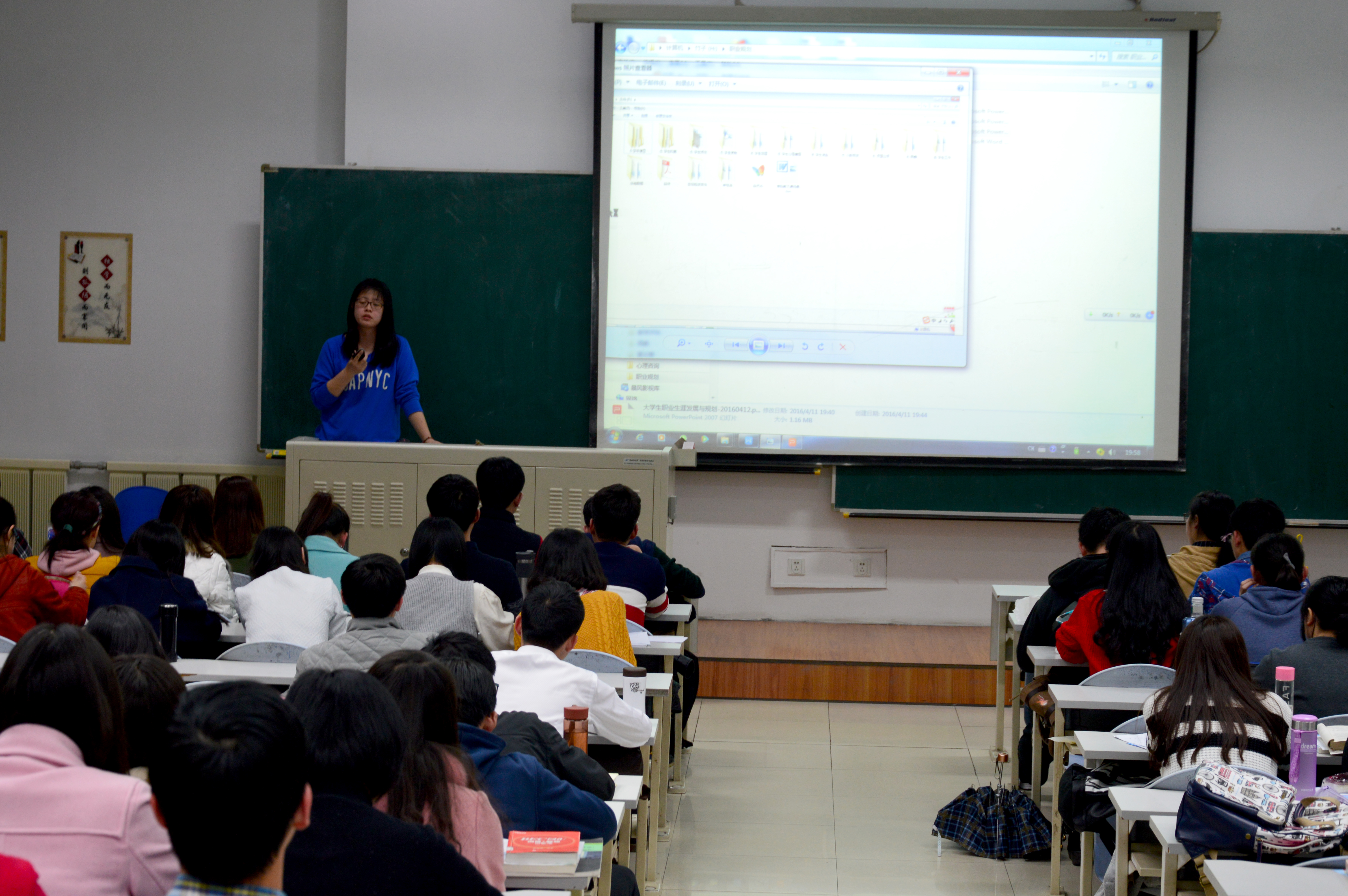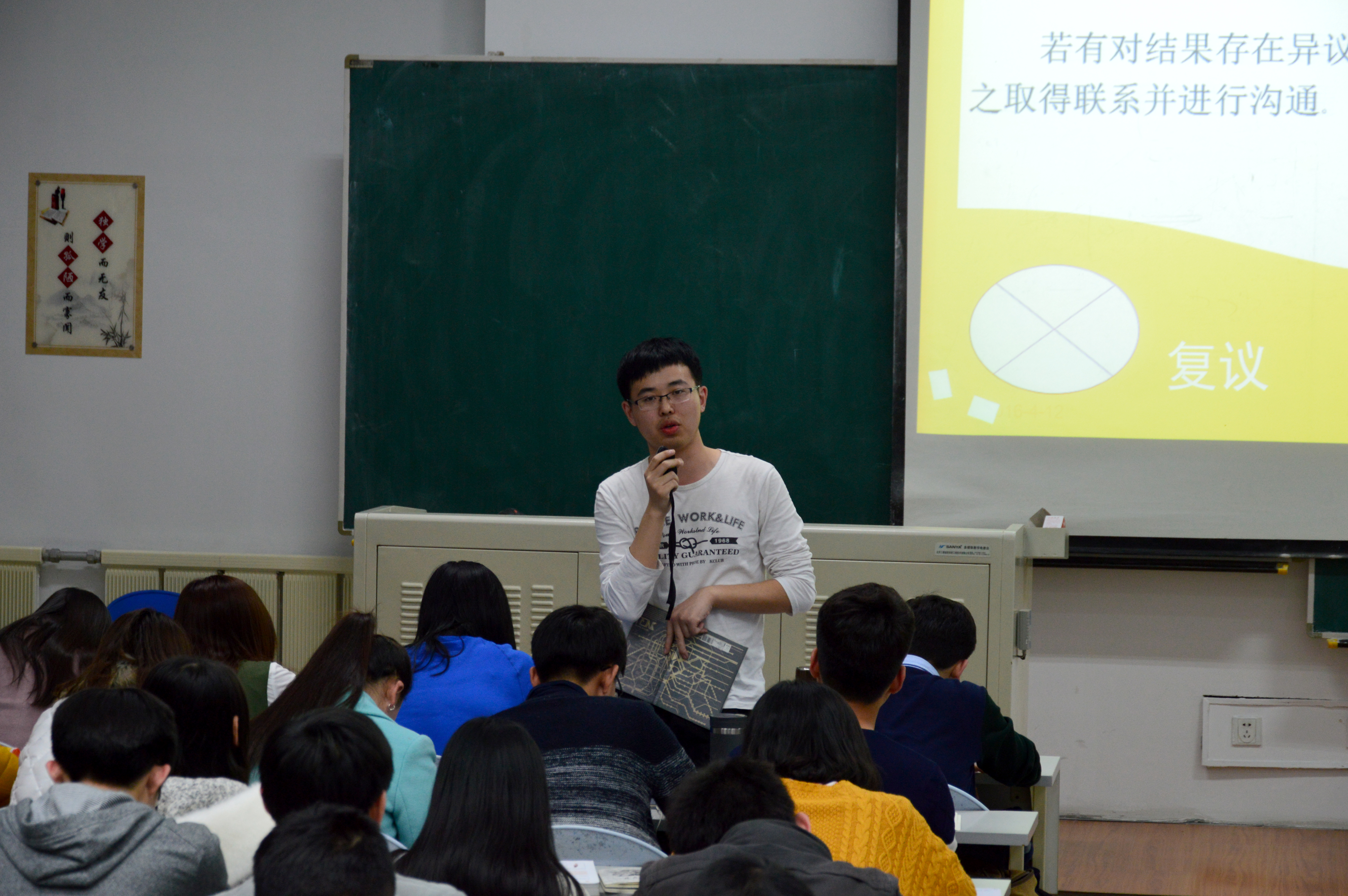 本次活动与2015级“大学生职业发展与就业创业指导”课程相结合,由 2015级全体学生干部组成八个小组,分别对夏令营活动、迎新季系列活动、汉字听写大会活动以及支教活动进行策划,并以PPT的形式进行展示。八组同学的活动策划都包含了前期筹备、活动过程及后期总结三个方面,并在活动细节、活动宣传等方面做出了较为详细的计划。一些小组在活动策划中提出了自己的创新想法,另一些小组则在参考前辈经验的基础上完善了活动方案。小组展示之后,2013级学生干部对各组的展示进行了深刻而又不失趣味的点评。他们对此次活动中各组的成果表示了充分肯定,并在活动细节、活动的可操作性等方面提出了建议。大会的最后,曲畅竹对本次活动进行了总结。她指出了此次学生策划活动中普遍存在的问题,提出要进一步将细节落在实处,并建议学生们学会从整体到局部的思维方式。