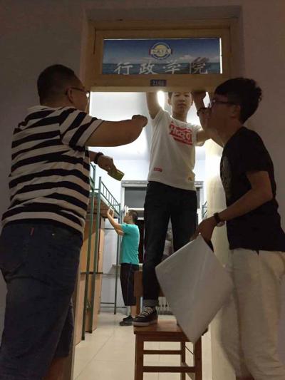 晚7时左右,曲畅竹带领学生干部来到前卫南区大学城二公寓、三公寓展开张贴布置工作。在曲老师的带领协调下,张贴工作进行得井然有序。两三个学生为一组,彼此之间分工协作,高效地完成了各项工作。张贴完毕后,学生干部们还检查了新生寝室门锁的完好情况,并记录下了需要报修的寝室。为让2015级新生入住更加便利,大家悉心检查,对于细节十分认真,表现出良好的工作风貌。