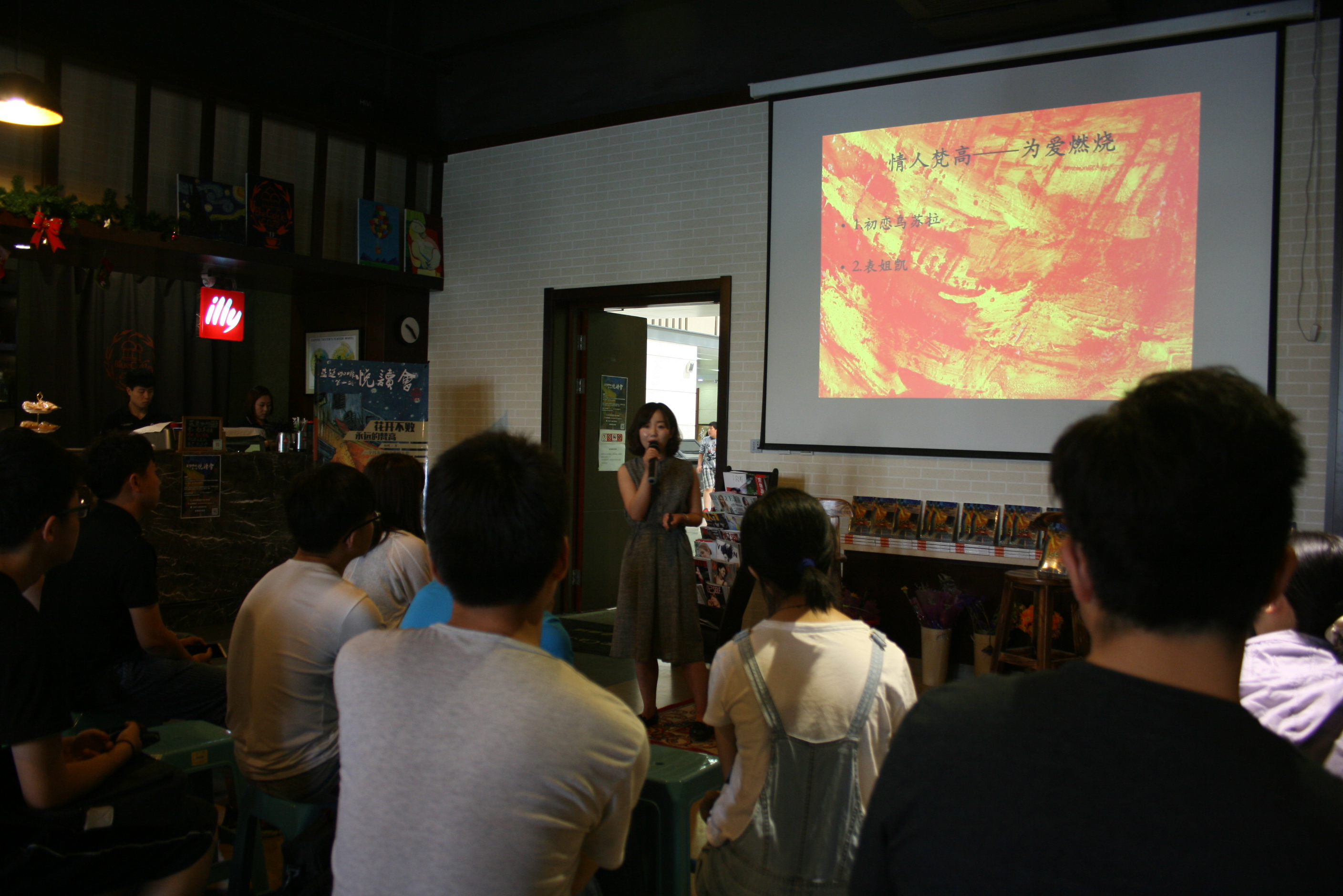 在参观结束后,同学们应邀参加了吉林省全民阅读协会《花开不败——永远的梵高》“悦读会”。80后美女作家周帆携同是作家的夏墨等好友向同学们介绍了自己的创作经历、作品以及自己创作的心路旅程。“悦读会”还邀请了专业美术老师深入解读梵高的代表画作,欣赏其中不可言喻的美;到场嘉宾现场吉他弹唱《Vincent》、《Hotel Califonia》更将本次活动推向了高潮。最后的提问环节,同学们的踊跃发言反映了思潮成员深厚的文化底蕴。时间很快过去,同学们合影留念,结束了此次活动。
