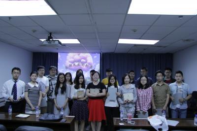留学的毕业生代表首先介绍了一些关于出国留学的注意事项,讲述了其利弊和具体要求,分享了自己了解到的赴美赴欧留学的流程和细节。代表们尤其强调了英语的重要性。国内读研的毕业生代表则和大家分享自己保研和考研的经历,在学习方面为同学们提供了一些建议。他们强调考研最重要的在于坚持,应保持良好心态,积极备考应考。毕业生代表们用自己的亲身经历告诉大家,应充分珍惜大学四年时光,努力学习,提升自我能力。在提问环节,在场观众就留学要涉及的学位证、留学中介和考研需要用到的参考资料等问题咨询了毕业生代表,代表们对其进行了耐心详细地解答。活动最后,2011级六位优秀毕业生代表和2012、2013级班委代表互相赠送了礼物,大家合影留念。