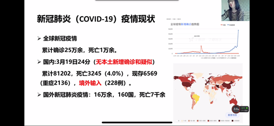 ,举办“护航复学复课,守卫健康安全——新冠疫情防控知识讲座”,组织两个学院全体教职工、研究生和本科生2200余人共上一堂课。讲座通过“钉钉”网络视频直播的形式进行,由公共卫生学院流行病学与卫生统计学教研室甄清副教授主讲,参加讲座的师生分布在祖国各地。