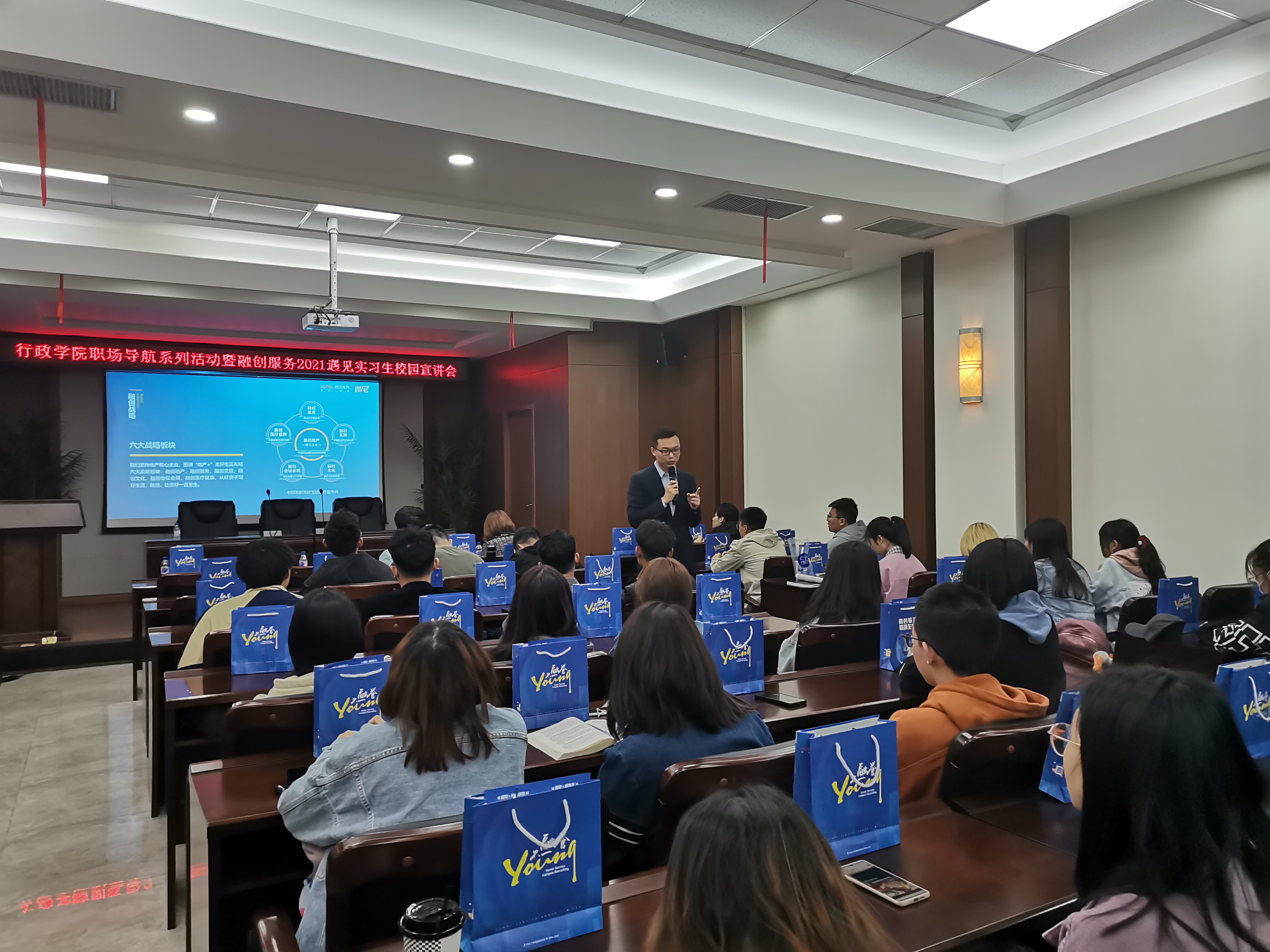 职业导航系列活动之融创服务“2021遇见实习生”校园宣讲会在东荣大厦B303举行。融创服务集团人力资源总监张东浩、校企合作负责人冷晓萌、校招负责人汪美玲等企业代表,学院近80名有就业意愿的本科生、研究生参与本次活动。活动反响热烈,取得良好效果。