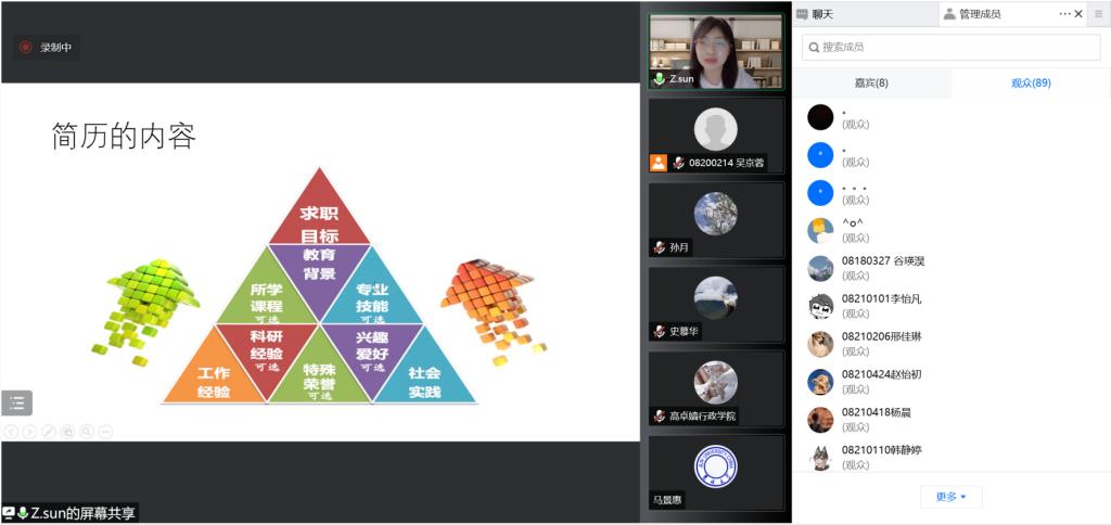 举行“云上就业指导小课堂”第二讲,邀请学校学生就业创业指导与服务中心指导科科长孙卓以视频会议形式为全体学生做线上辅导报告。学院党委书记马景惠、党委副书记史慕华、本科生辅导员、研究生辅导员、毕业年级及其他年级研究生和本科生参加报告会。报告会由国产色情