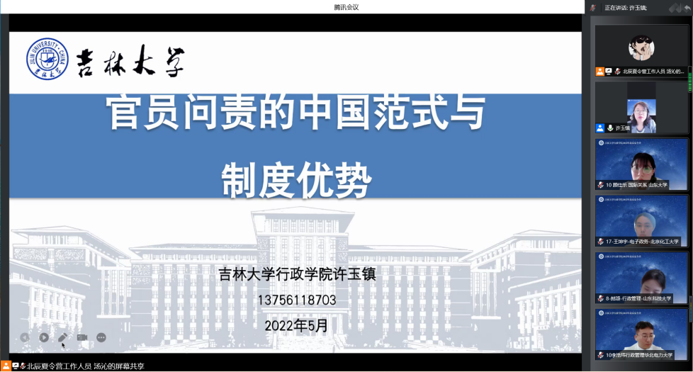 博士生导师许玉镇教授做专题学术报告。许玉镇以《官员问责的中国范式与制度优势》为题,从官员问责的世界之问与时代之问切入,比较了中西方官员问责的异同,结合当前的新冠肺炎疫情防控工作问责和新近全国纪检监察机关问责情况等鲜活案例,阐释了中国官员问责制度优势,并与营员进行了充分学术交流。