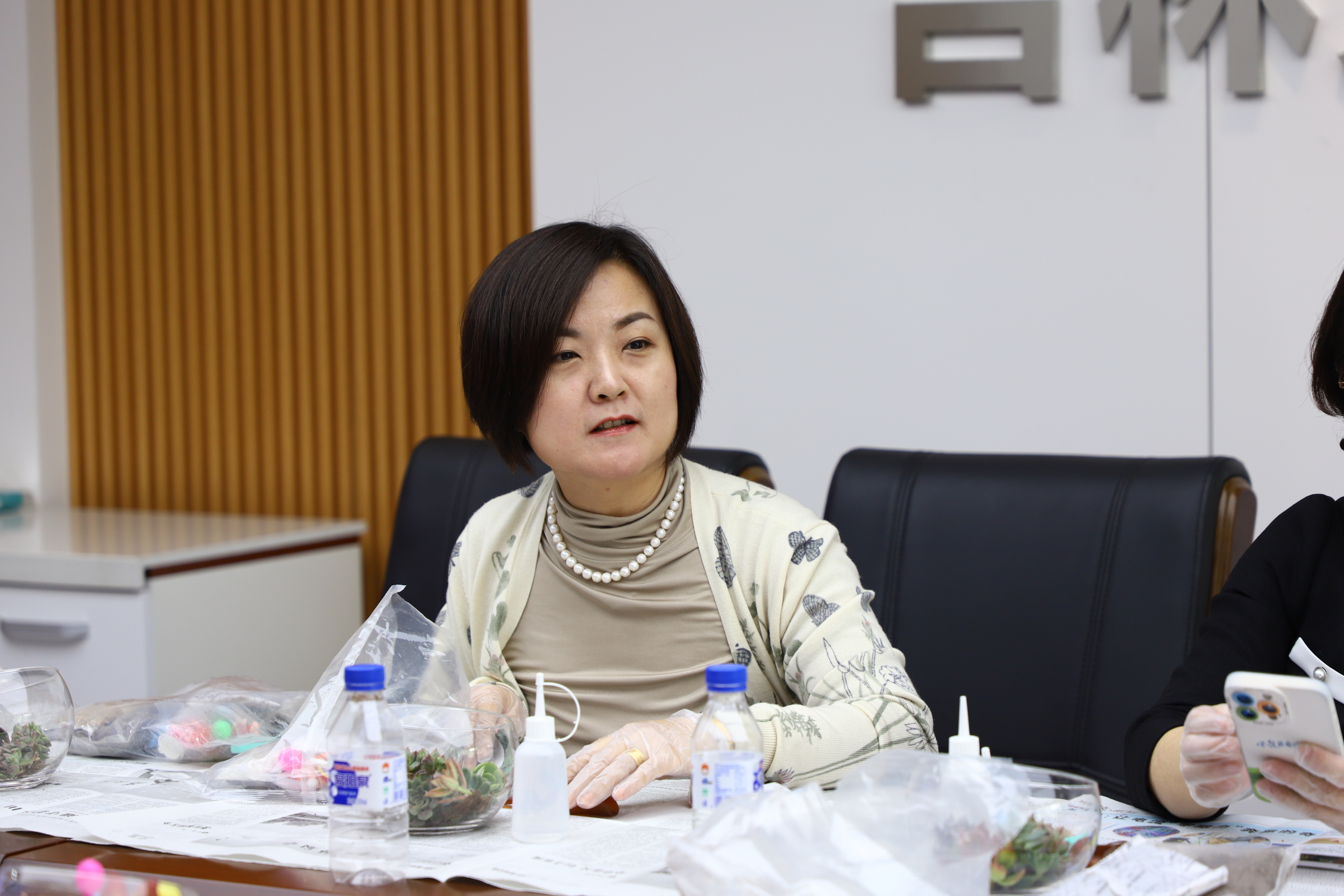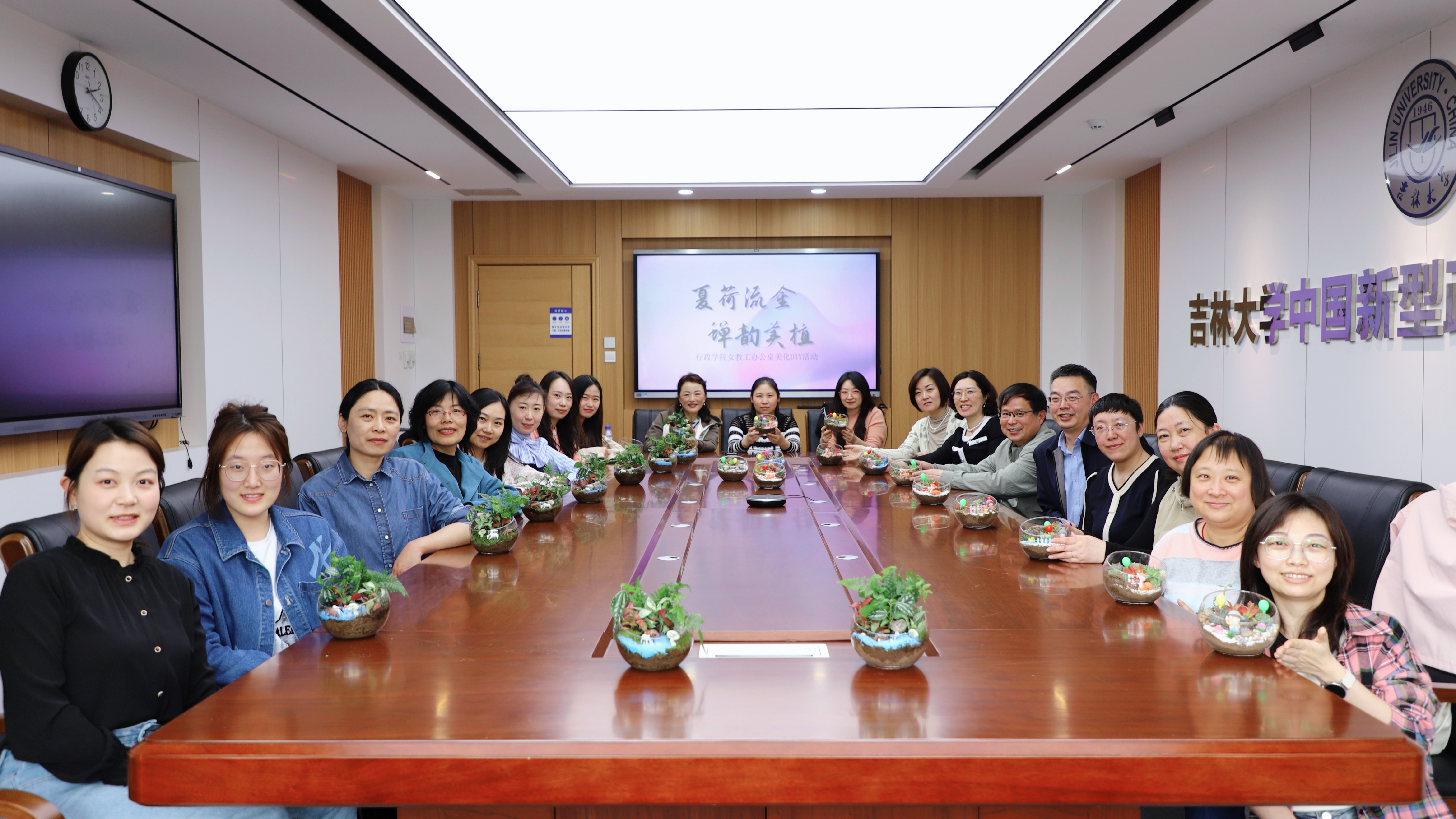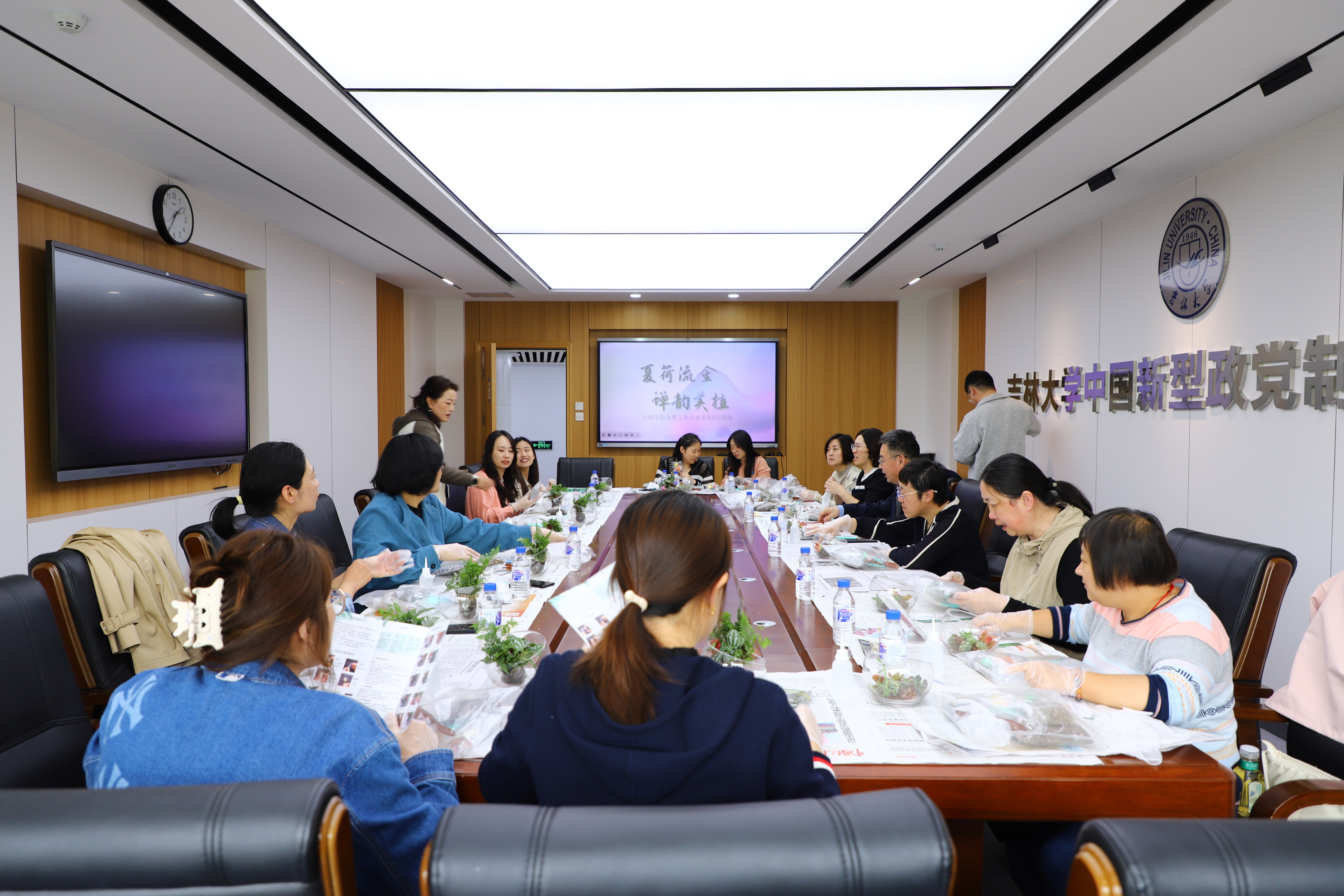 妇委会举办“夏荷流金·蝉韵美植”办公桌美化DIY活动,学院党委书记陈希贵、副书记史慕华、副院长刘畅、行政副院长季洪涛、妇委会主任薛洁、妇委会副主任王欣及报名活动的学院女性教职工参与活动。