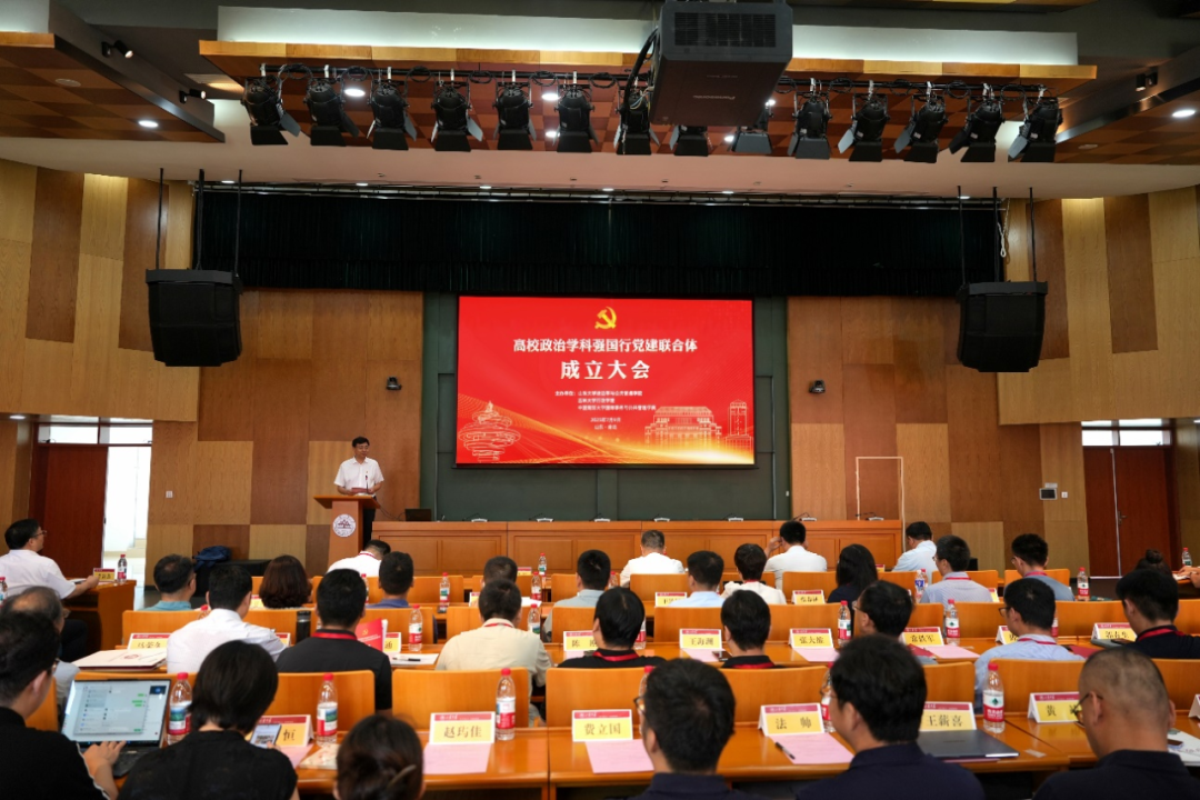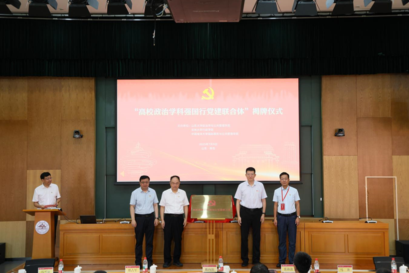 院长马雪松表示党建联合体要打破校际壁垒,整合学科资源,对关键领域开展联合攻关,推出一批具有标志性、引领性的研究成果,服务于国家治理现代化。陈向阳、马雪松、山东大学政管学院院长马奔、中国海洋大学国际事务与公共管理学院副院长弓联兵共同为党建联合体揭牌。