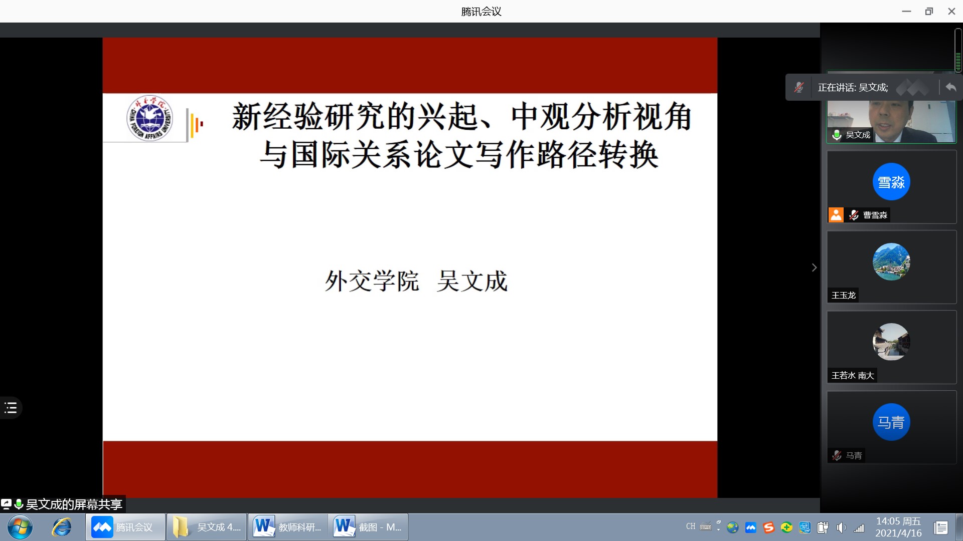 主办的教师科研水平提升计划第二十期活动在腾讯会议室举行。本次讲座邀请《外交评论》编辑部主任、清华大学《国际政治科学》编委、外交学院吴文成副教授担任主讲嘉宾,作题为“新经验研究的兴起、中观分析视角与国际关系论文写作路径转换”的学术讲座。国产色情