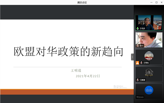 王明进教授从大变局与欧盟自身危机、欧盟对华政策的基本考虑、欧盟对华政策的新趋势、中欧关系的前景四部分出发,向参加讲座的师生做了详细的介绍。