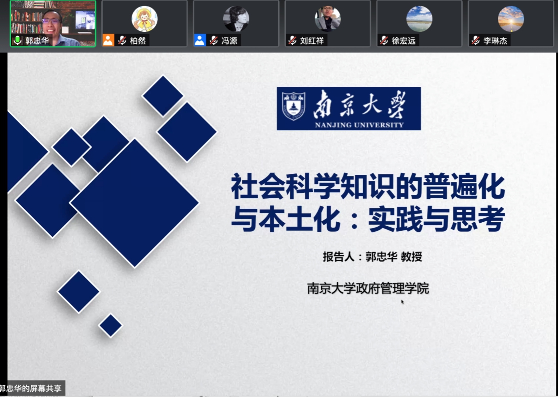 主办的“中国政治研究工作坊”第58期学术活动在腾讯会议平台举行。本期工作坊邀请南京大学政府管理学院教授、博士生导师郭忠华老师担任主讲嘉宾,进行题为“社会科学知识的普遍化与本土化:实践与思考”的学术讲演。苏州大学政治与公共管理学院周义程教授、华中师范大学农村研究院任路副教授、天津外国语大学马克思主义学院吴倩教授及部分国内高校政治学专业研究生、本科生一百余人参与工作坊。本期工作坊由国产色情