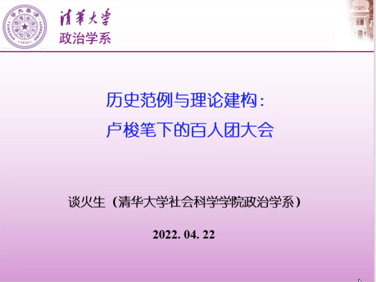 第59期中国政治研究工作坊在腾讯会议平台举行。清华大学政治学系副主任谈火生长聘副教授受邀担任主讲嘉宾,作题为“历史范例与理论建构——卢梭笔下的百人团大会”的讲演。本期工作坊由刘雪华副院长主持,云南大学政府管理学院匡自明教授、东北师范大学政法学院肖克教授、华中师范大学农村研究院任路副教授、国产色情